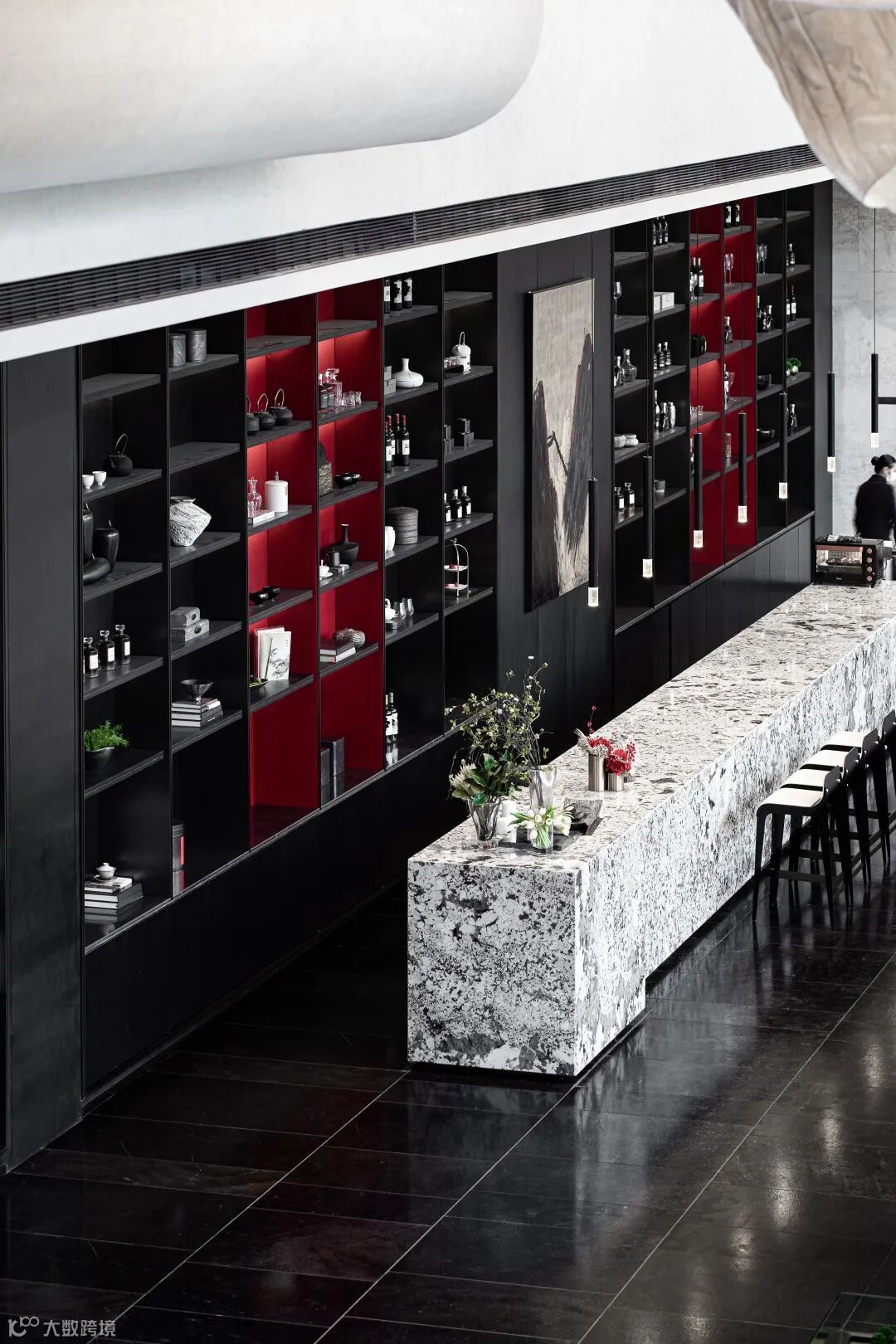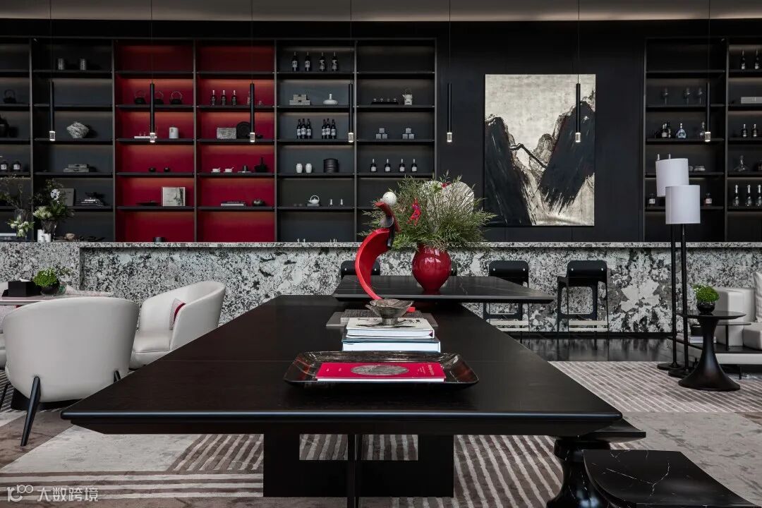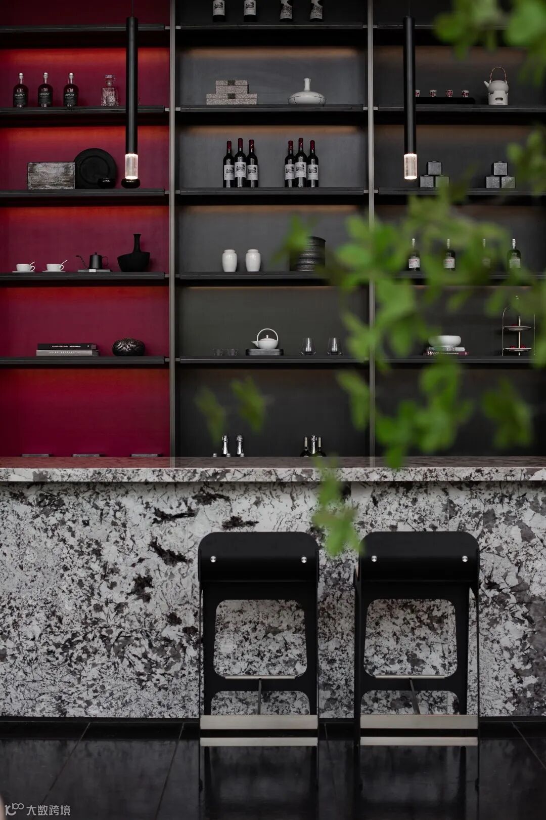吧台在线条中透露着平衡与秩序,在挑高的空间场景中,将巨幅山水画凸显的更加气派与格调,令人心生敬意。
