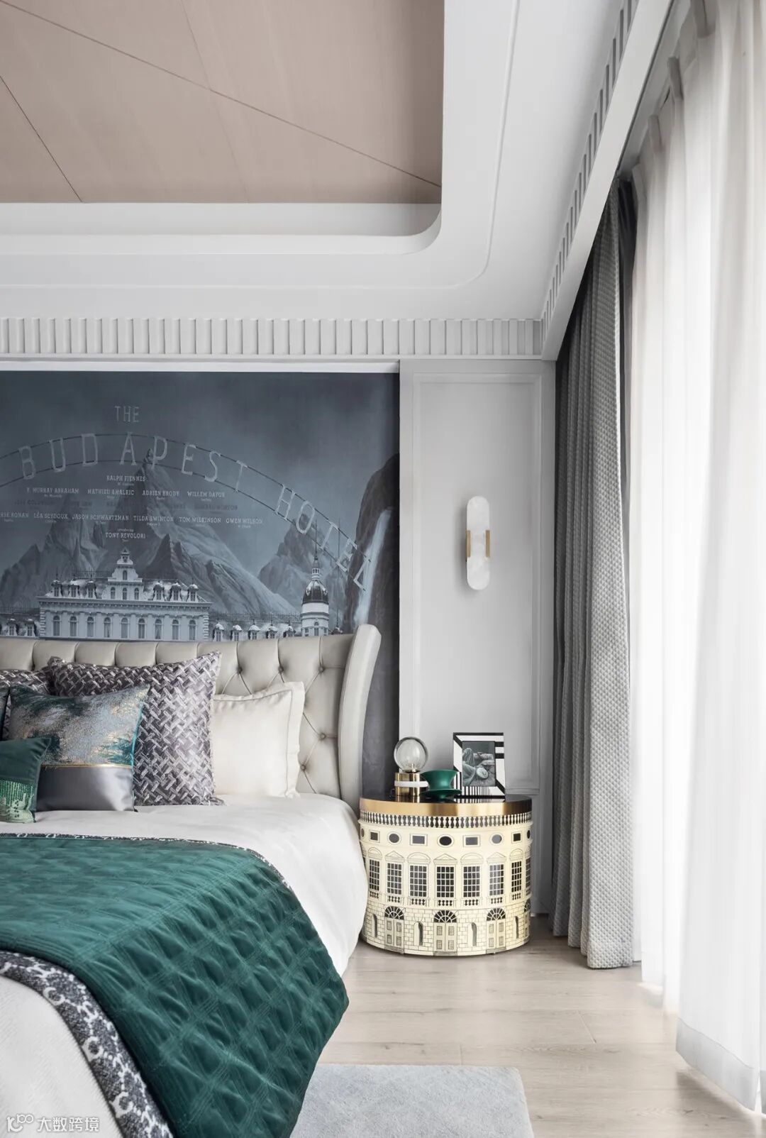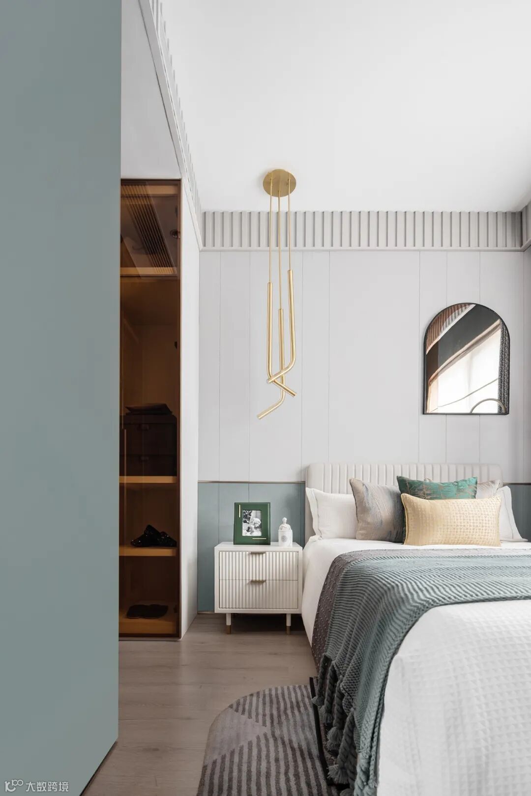 较之摩登复古的主卧,客卧显得淡雅素净。镀金的灯管曲折出优雅的弧度,蓝绿的织物染上雾霭似的灰,仿佛侯麦镜头下的春天,有着漫不经心的明朗气息。