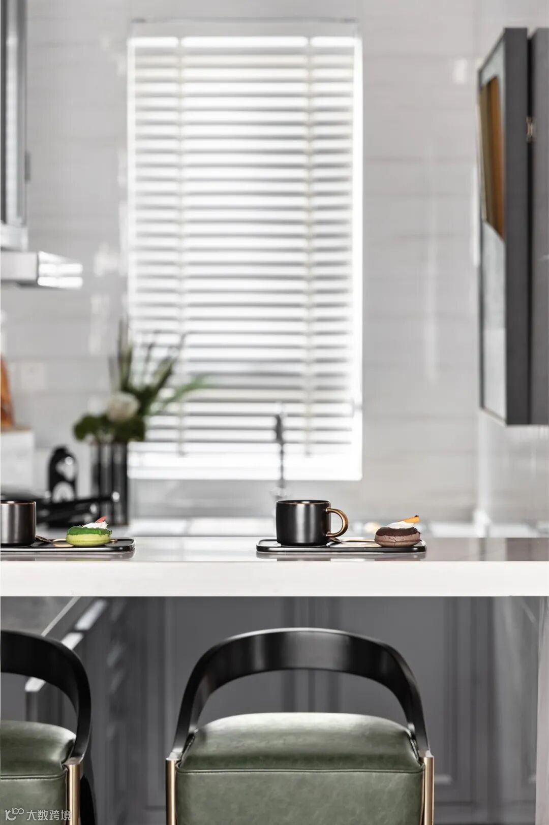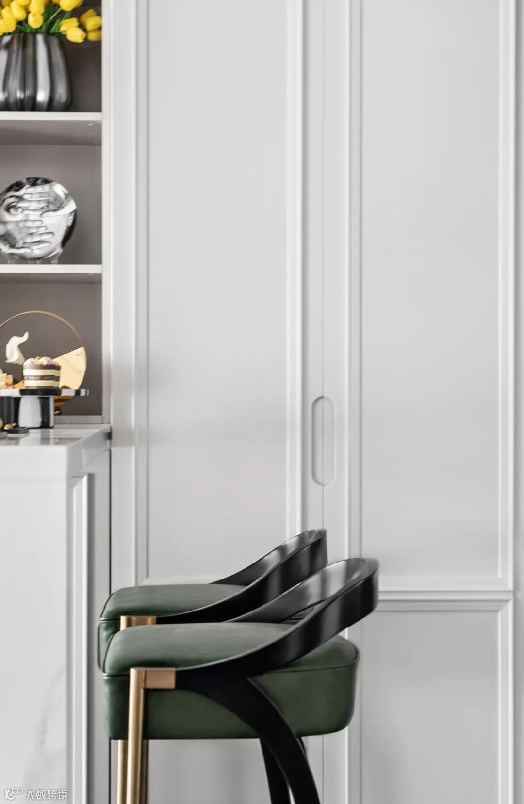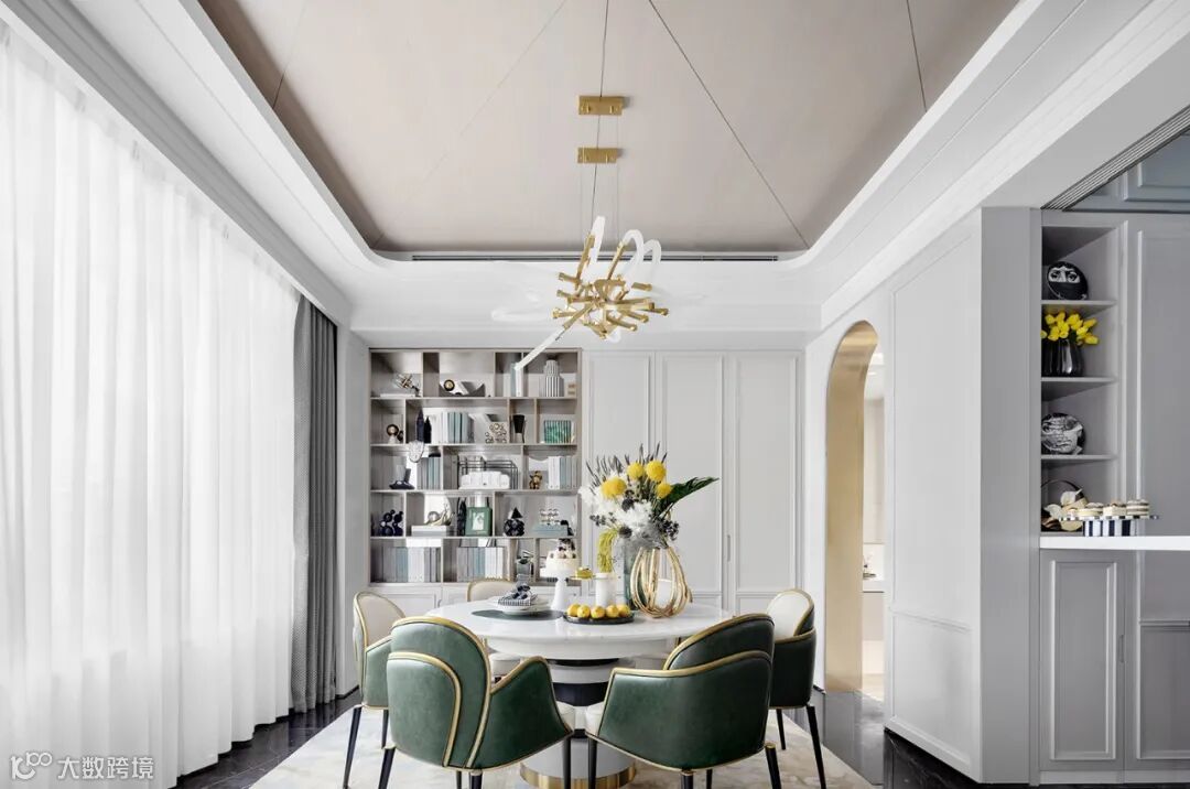 L形厨房的欧式灰色柜门纵向延伸,在跨越功能分区之际转成灵活的水吧台,传达出特调咖啡的意式闲趣。餐厅则采用镀金工艺的餐椅,椅背层叠如法兰西玫瑰,瓣瓣都是欲言又止的浪漫,与粲然的花束默契呼应。