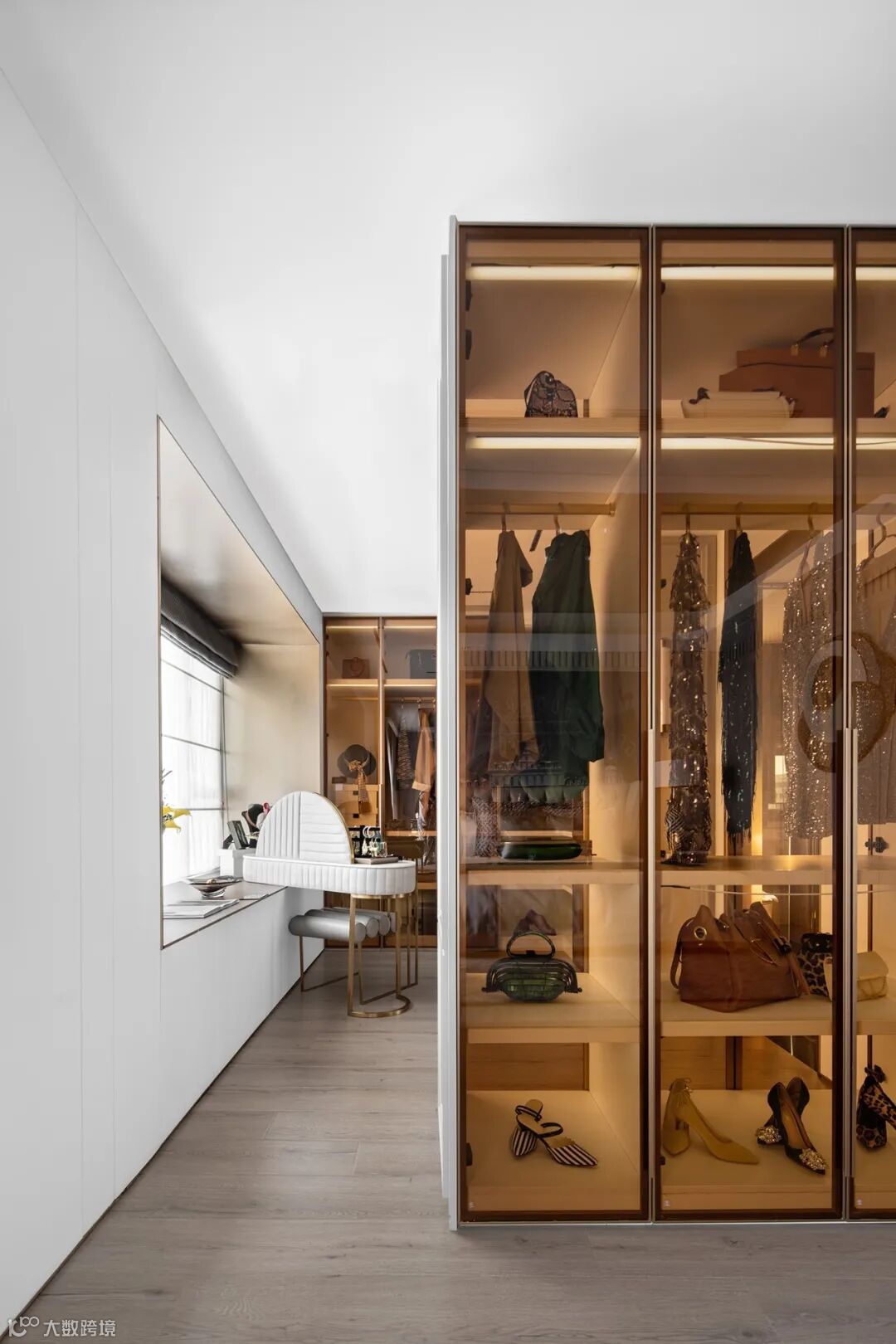 主卧的双衣帽间是居住者的时尚T台。灯光亮起,香槟色的衣橱玻璃恍若浮动着重重的衣香鬓影;月落日升,满溢的光线透过大尺寸的飘窗唤醒清晨。精致简约的摆饰,一如窗口鹅黄的茶,都昭示着春日里特有的欢欣与悸动。