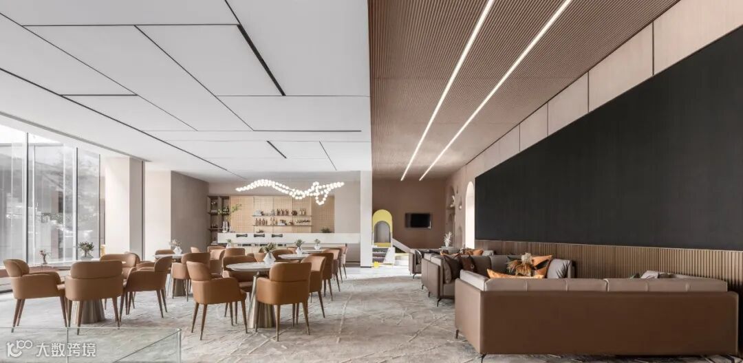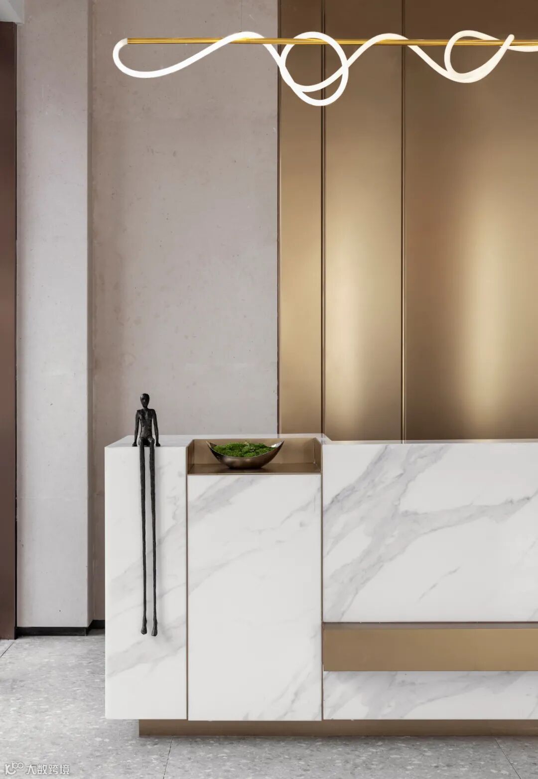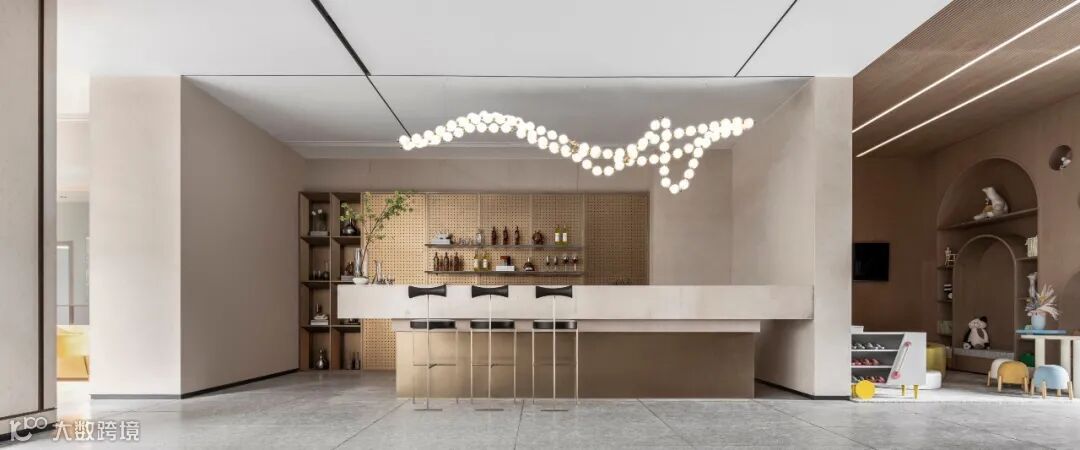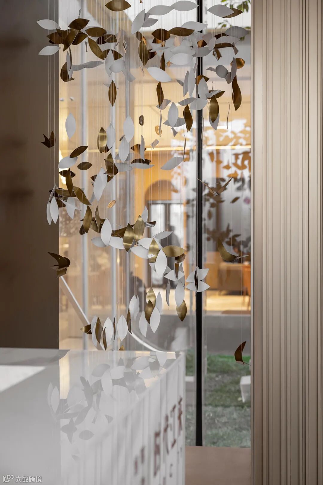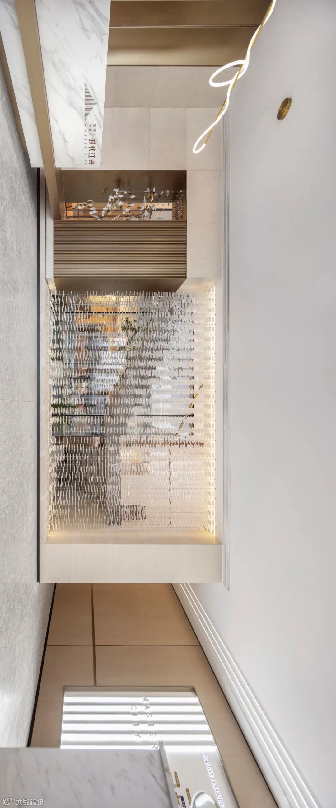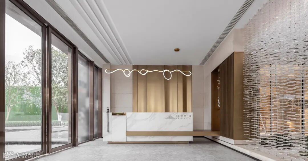 序章即是惊艳。接待厅内,穿流的光借由不同载体呈现出殊异的形制——精致纤巧如碎叶,翩跹跃动;璀璨粼粼如微波,涟漪轻泛;化象走笔如绮思,蜿蜒舒展。黄铜与素色相接,为这方流光溢彩铺展出方正的礼序界面。