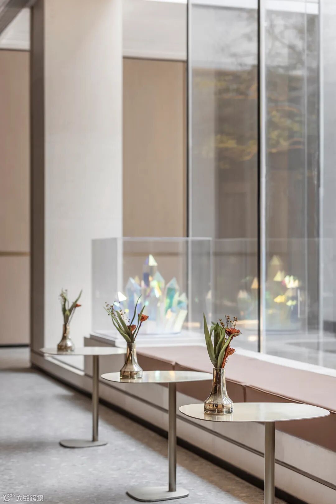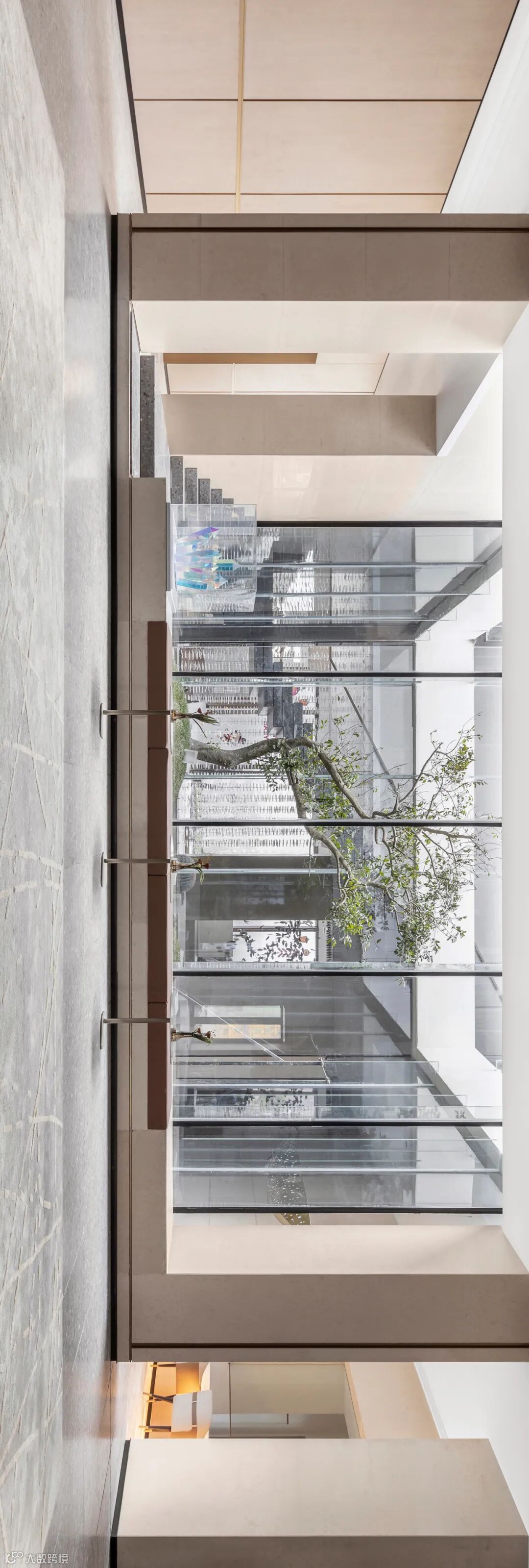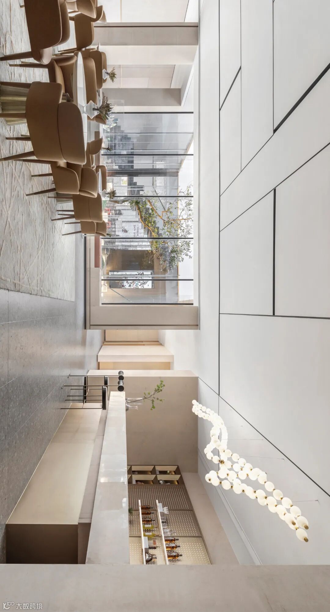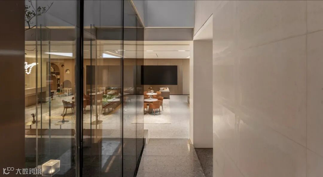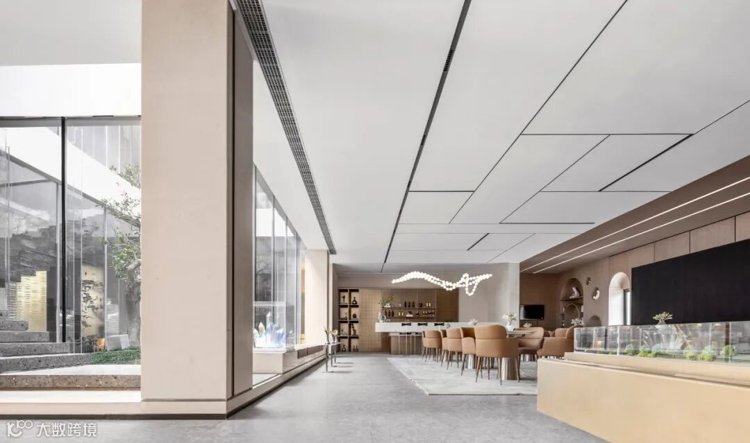 序章即是惊艳。接待厅内,穿流的光借由不同载体呈现出殊异的形制——精致纤巧如碎叶,翩跹跃动;璀璨粼粼如微波,涟漪轻泛;化象走笔如绮思,蜿蜒舒展。黄铜与素色相接,为这方流光溢彩铺展出方正的礼序界面。