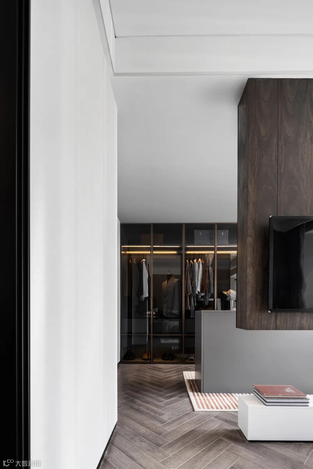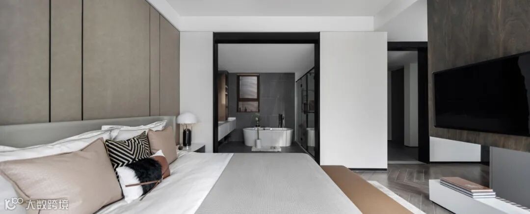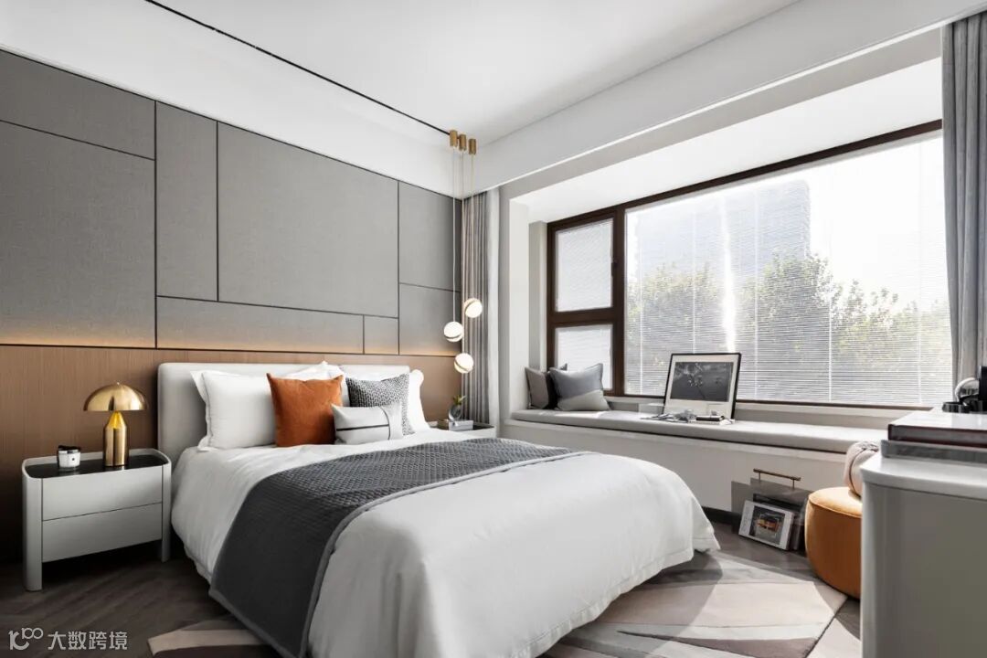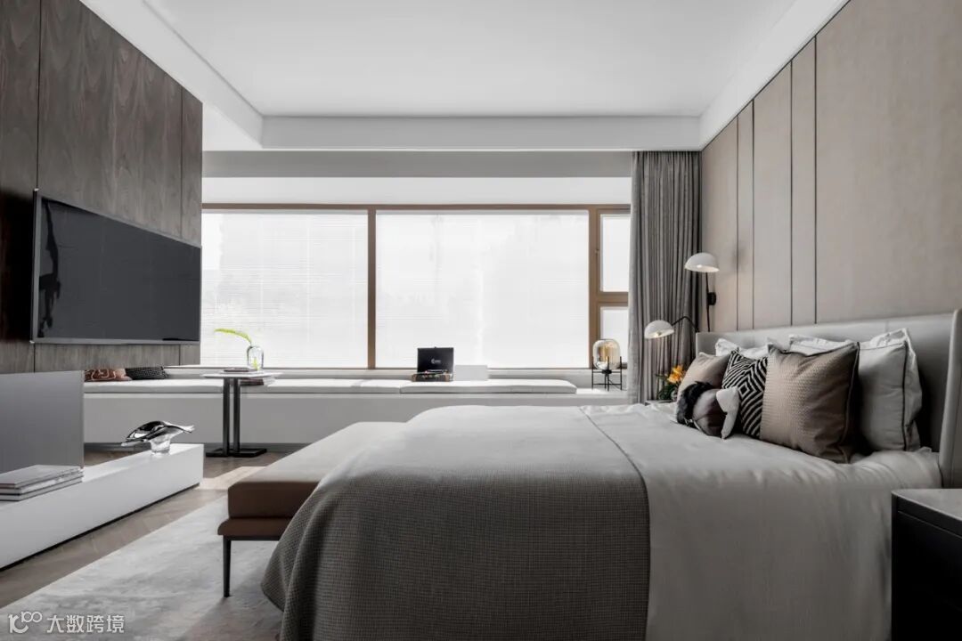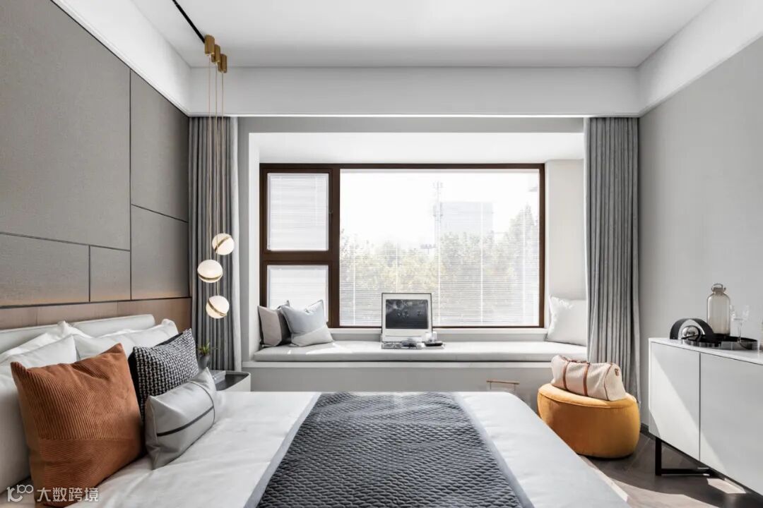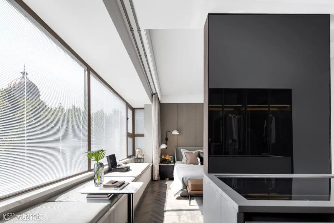 主卧拥有绝佳的空间尺度,偌大的落地窗,让空间有着自然明亮的光照环境,也更加凸显了空间中各式材质的精致感。雅致、品质、时尚、意蕴、美学,是这个空间的关键词,呈现出现代都会风自明自信的优雅气度。中性配色结合简约的装饰元素,赋予空间一种现代时尚感。