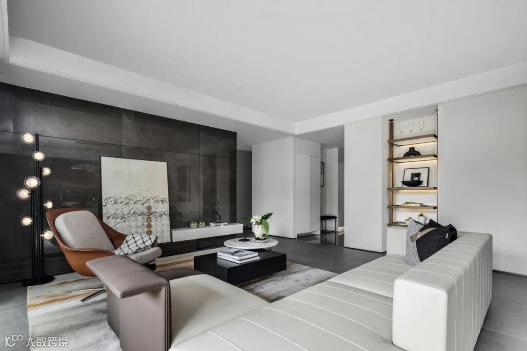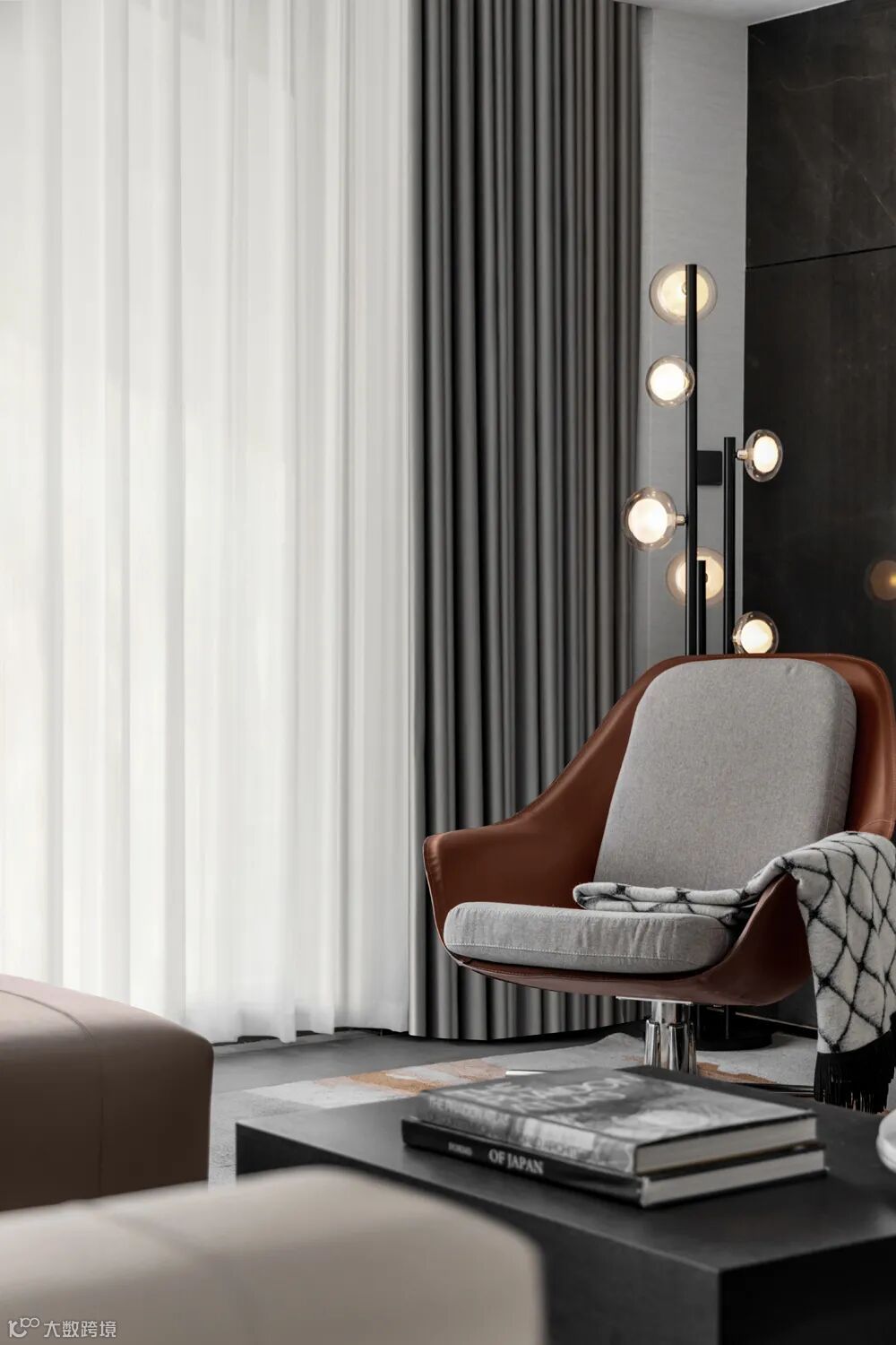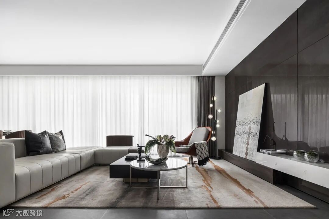 区别于一般的豪宅设计,本案更多的考量人在空间中的生活品质,使用现代简洁的线条表达出当代生活的高端品质与态度,皮质沙发、大理石茶几以及色调与家具完美契合的质感地毯,均以绝佳的材质,展现出对精致生活的追求。其次,设计还利用了简约而别致的艺术装饰画提升空间的艺术氛围,于内敛质感中凸显轻灵优雅。