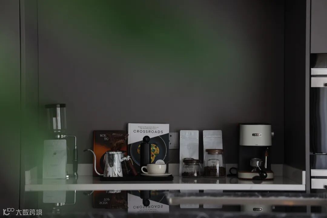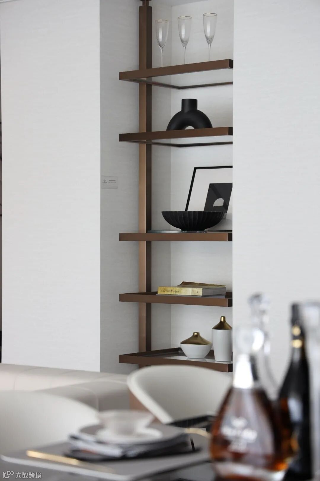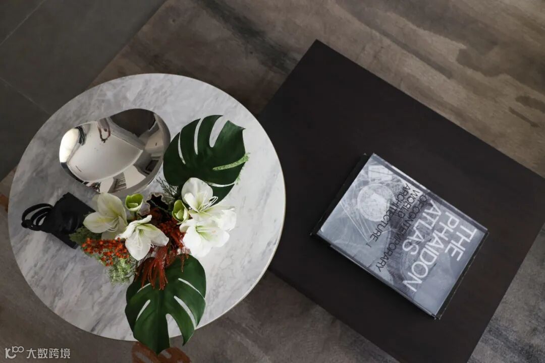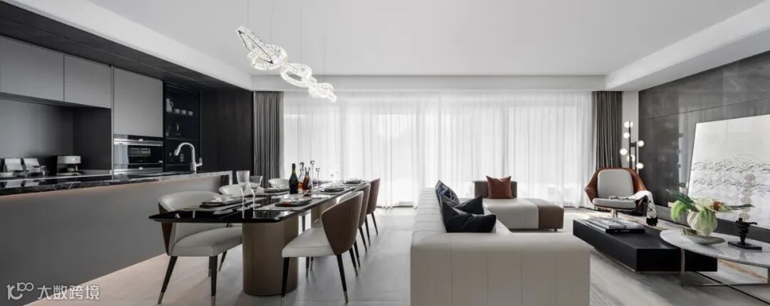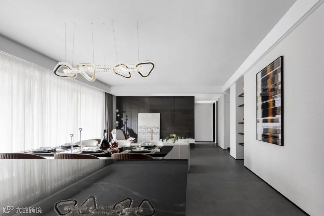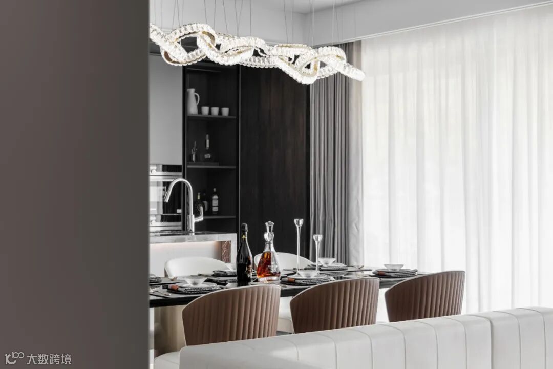开放式餐厅设计延续了客厅空间的优雅质地,经典的灰白黑色调彰显着空间的不凡品味,而棕色与白色结合的餐椅,赋予空间更多温暖感受。皮质、石材、通透玻璃,材质之间的呼应与碰撞,回应着品质生活中的各种互动联系。而艺术品和曼妙花艺的装点,暗合日常生活美学的构建。
