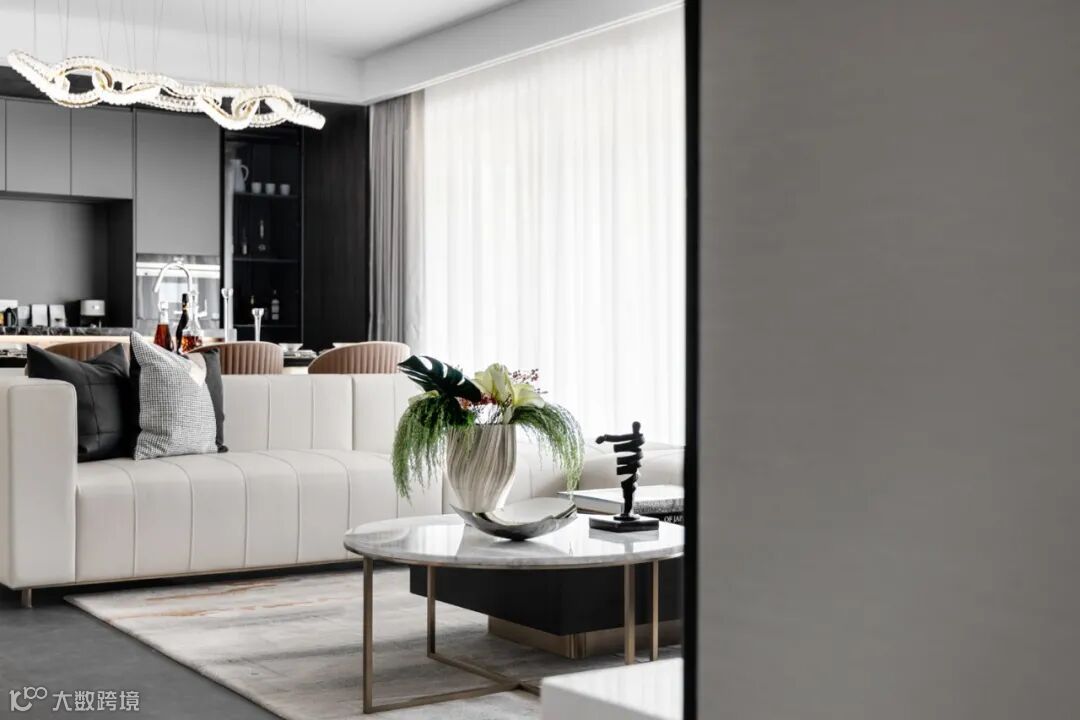简约大气与舒适雅致兼备,是客厅空间给人的第一视觉印象。开放的布局、灵活的动线以及低调的配色,奠定了空间整体简洁又极具质感的风貌。在软装陈设上,设计师将高端雅致都市生活与现代艺术结合,赋予空间时尚风度和简雅气度。