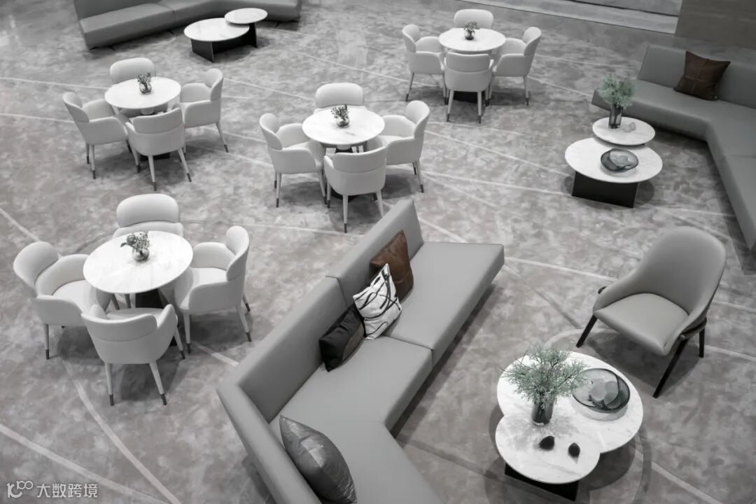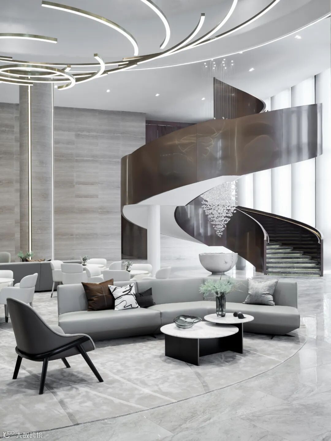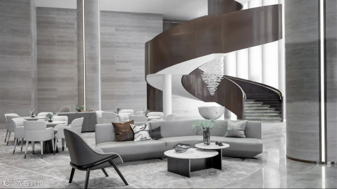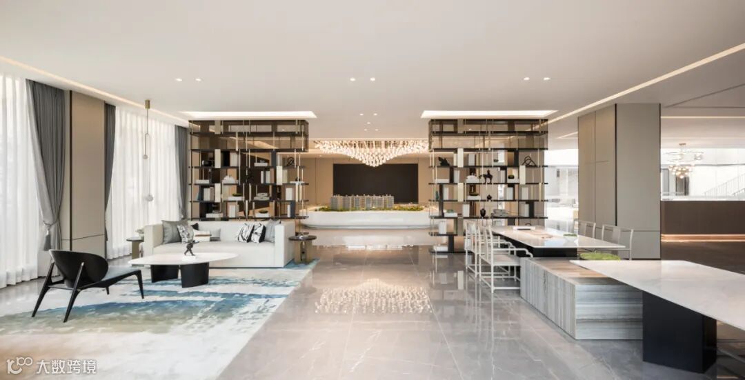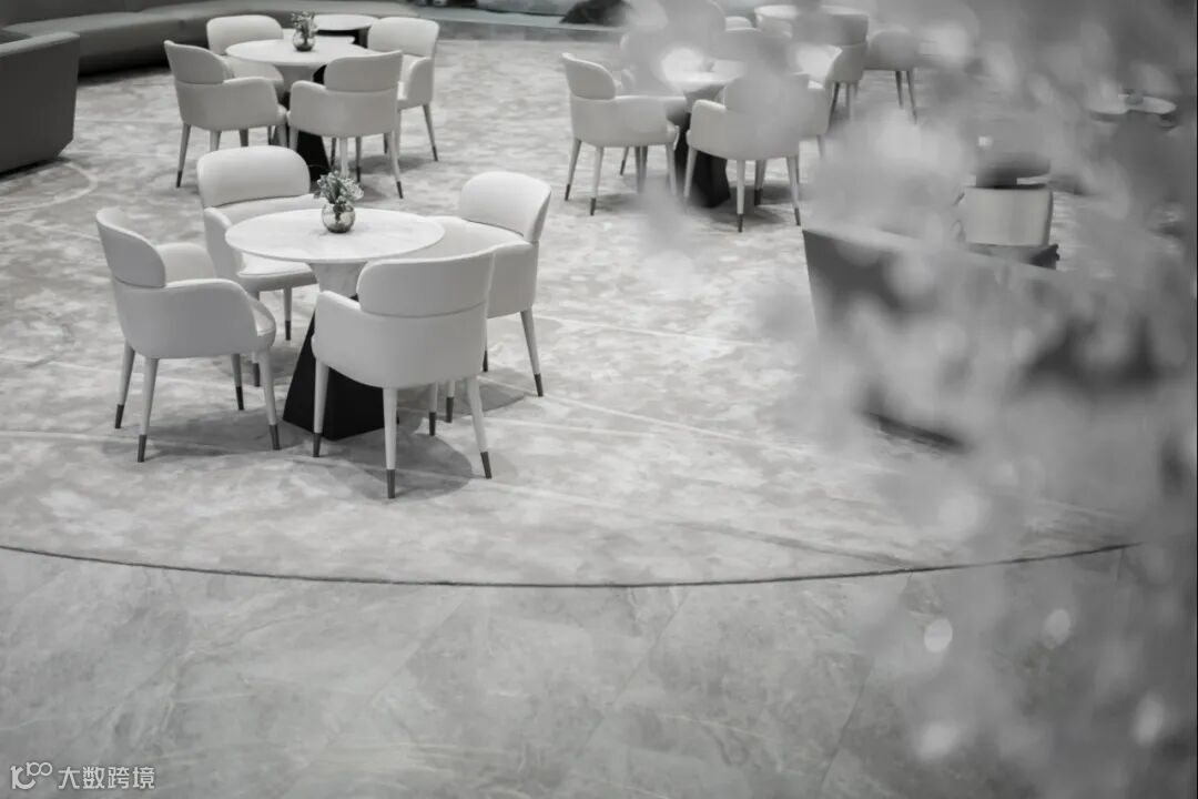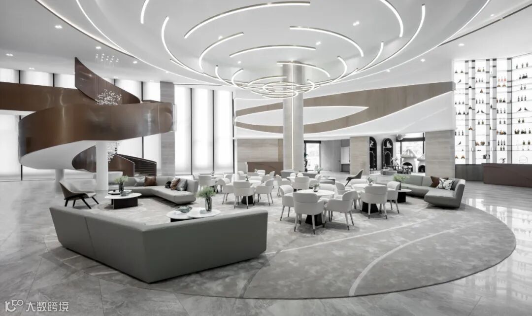 曲线的曼妙在于起伏宛转,在于呼吸流畅,亦在于如山如水的浩渺情味。两层挑高的洽谈区中,曲线作为重要的视觉线索贯穿于多个空间层面,打破了横平竖直的方正对称,取而代之的是一幅通透变化的形意画卷:仰观波纹断续如聚,俯察水墨如漫如浸,俯仰之间生息流动。往细处推敲,座椅的扶手、靠背、茶几桌面的弧线,俱是曲线一以贯之的起承转合。