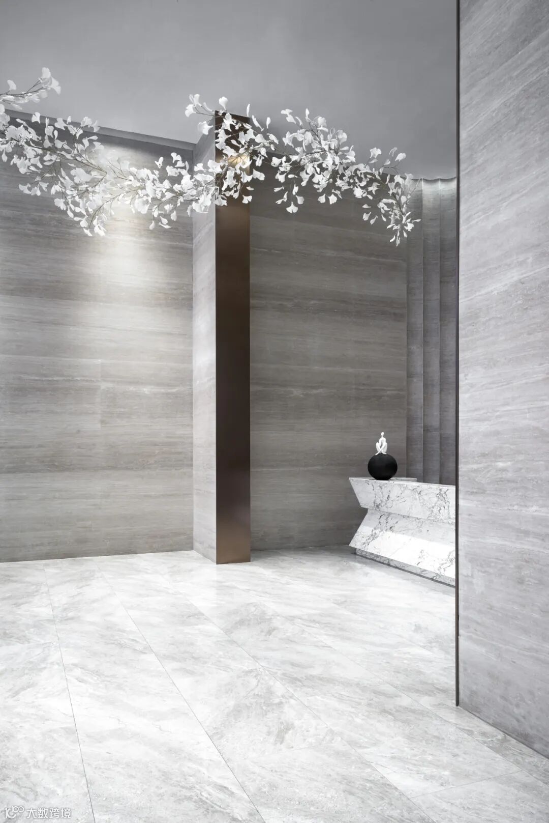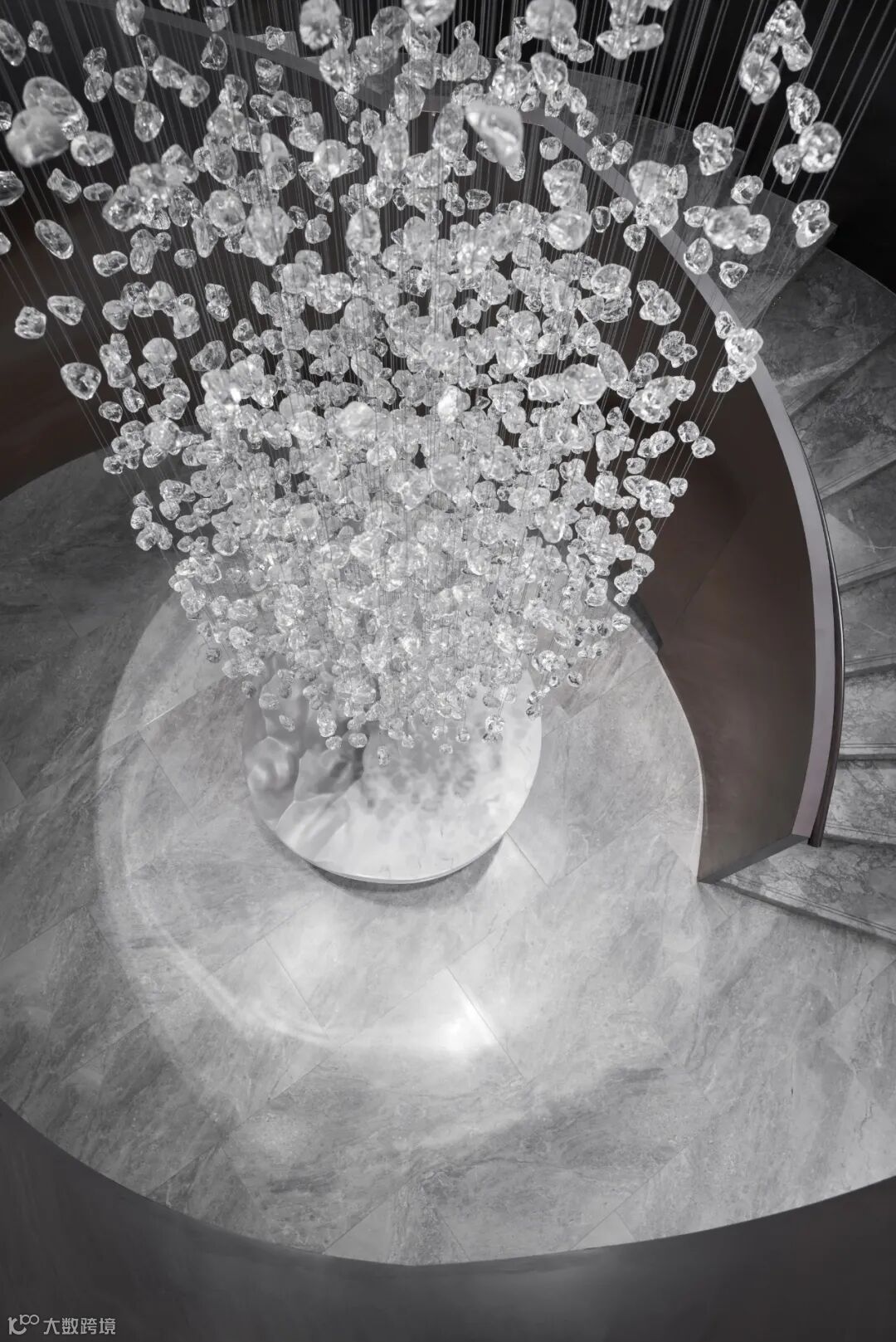 旋梯扶摇而上,轴心处水滴落石腾空而下,仿佛时光在流动之中倏忽停摆,将万物于片刻中定格成了永恒光景。碎雨击石,嘈嘈切切,落在水色氤氲的石材上四下漫淌,澄观的诗意有如实质。