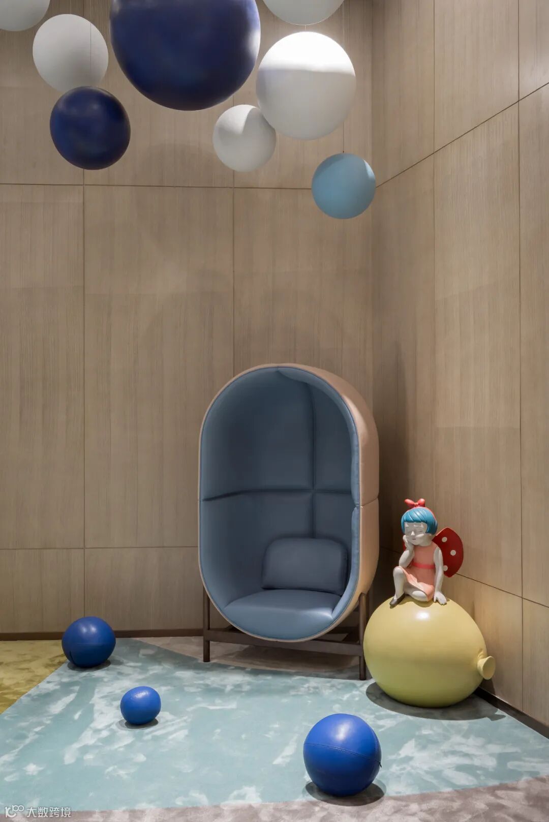 Curves are also favored by children for its radian caters the nature of kids. Round edges of the tables, chairs, bookcases without straightforward angles, gives the viewer a soft visual experience. In addition, the rich colour combination of lake blue, light turquoise, dark green, warm wood, dark blue, bright yellow creates a dreamy fairy tale kingdom.