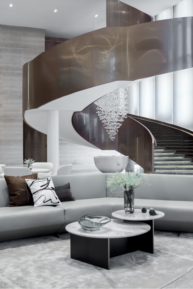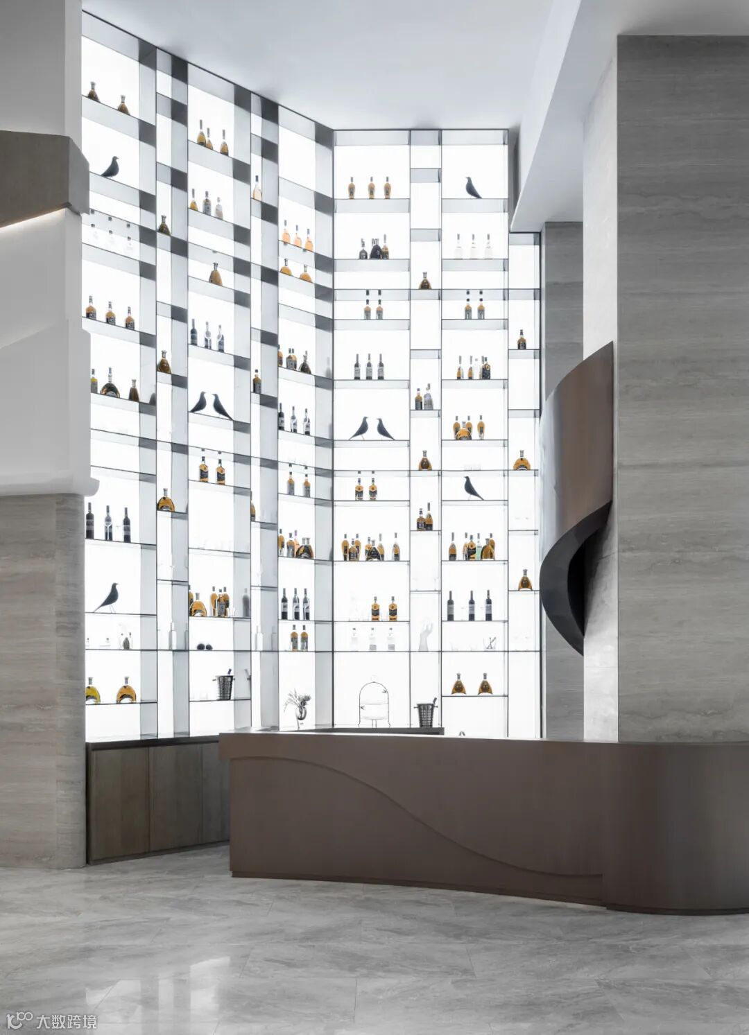 洽谈区另外一侧的水吧台也形成了鲜明的视觉焦点——两层高的玻璃酒架在内置灯带的烘托下显得明亮通透,水吧台面则延续旋梯造型,如飘带漫卷而上。
