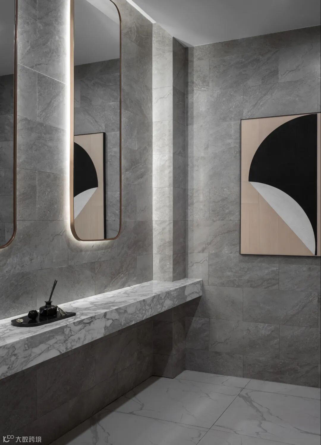洗手间内,材质的水波纹肌理在立面上得到了延续,纯粹的浅淡背景让这一隅空间更为静谧松弛。镜面的圆角、现代挂画装置则以不同形式呼应着曲线的主题。