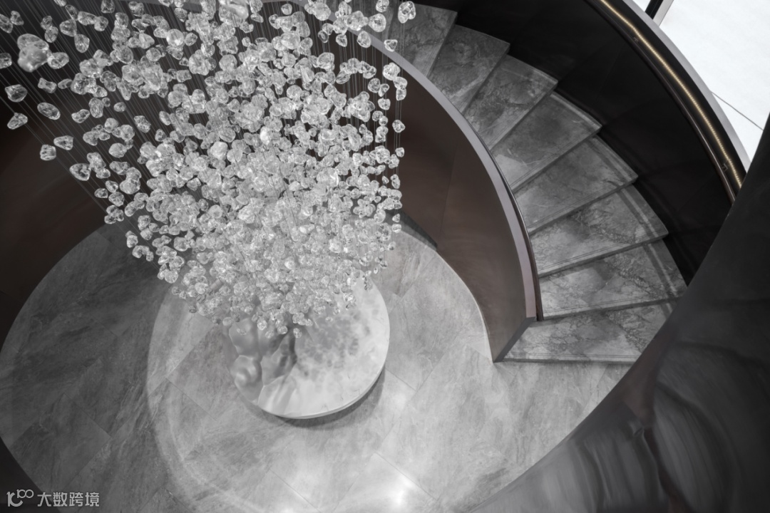 Surrounded by the spiral staircase is a luxury water-pearl shaped ceiling lamp, pouring down from the above like waterfall sprays. Walking up the staircase around the shining ceiling lamp gives you a fantastic hallucination where time seems to be frozen and locked in these dropping pearls.