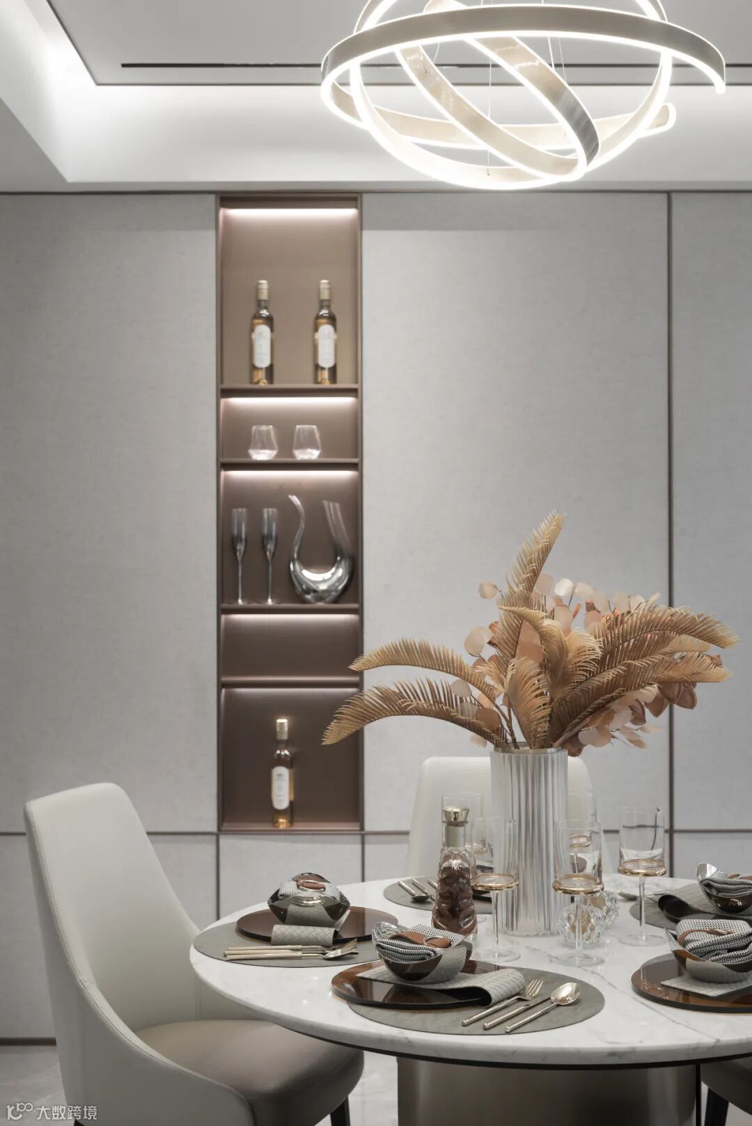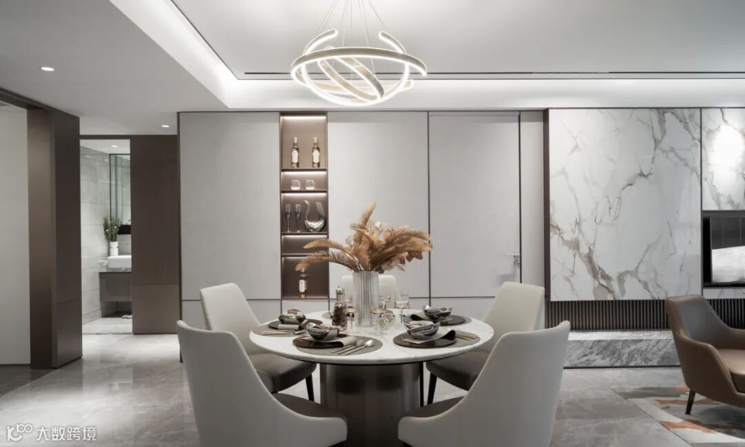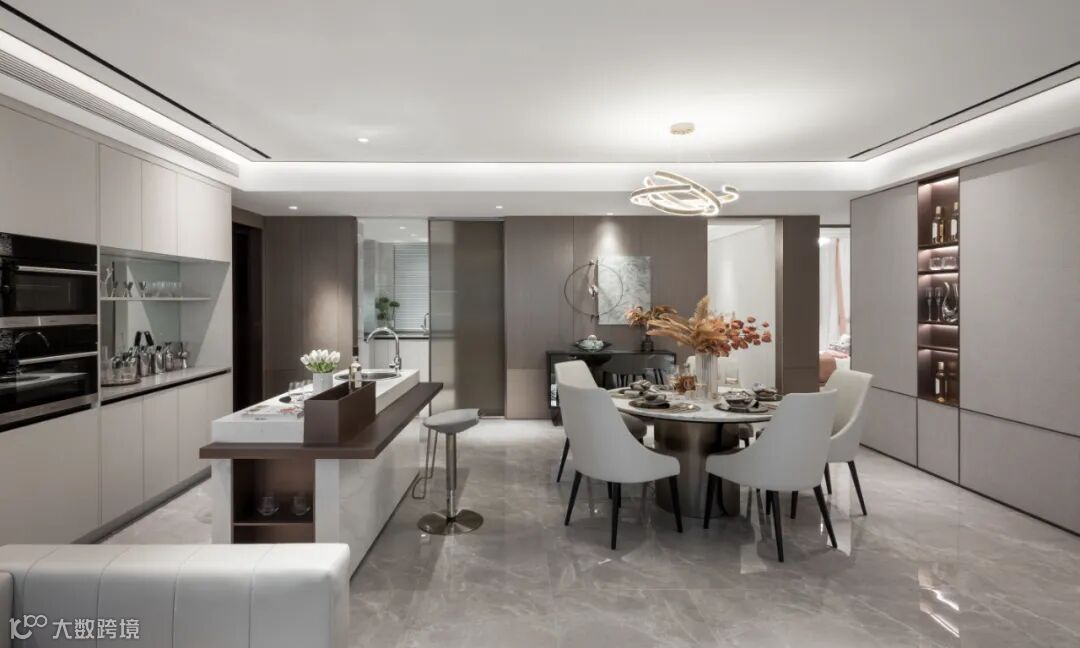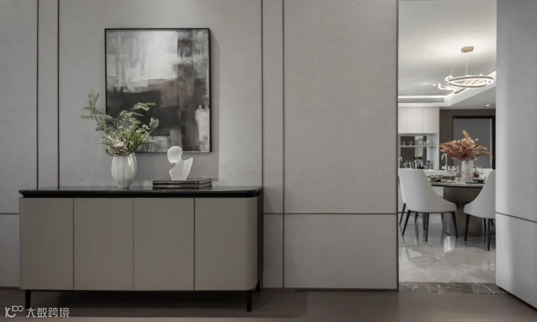 中西厨被移门隔开,空间在功能上的异同以及视觉上的隐现关系随之被拆解重组。而变化细腻的端景构造,又在艺术层面上实现了调性的共振,统一了整体语境。