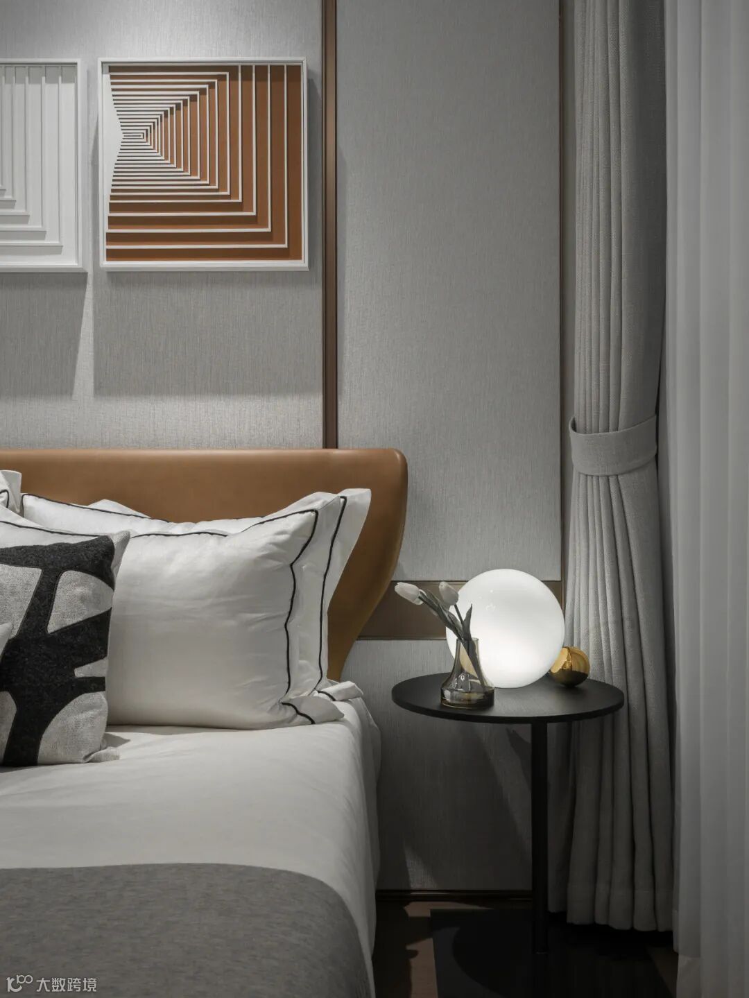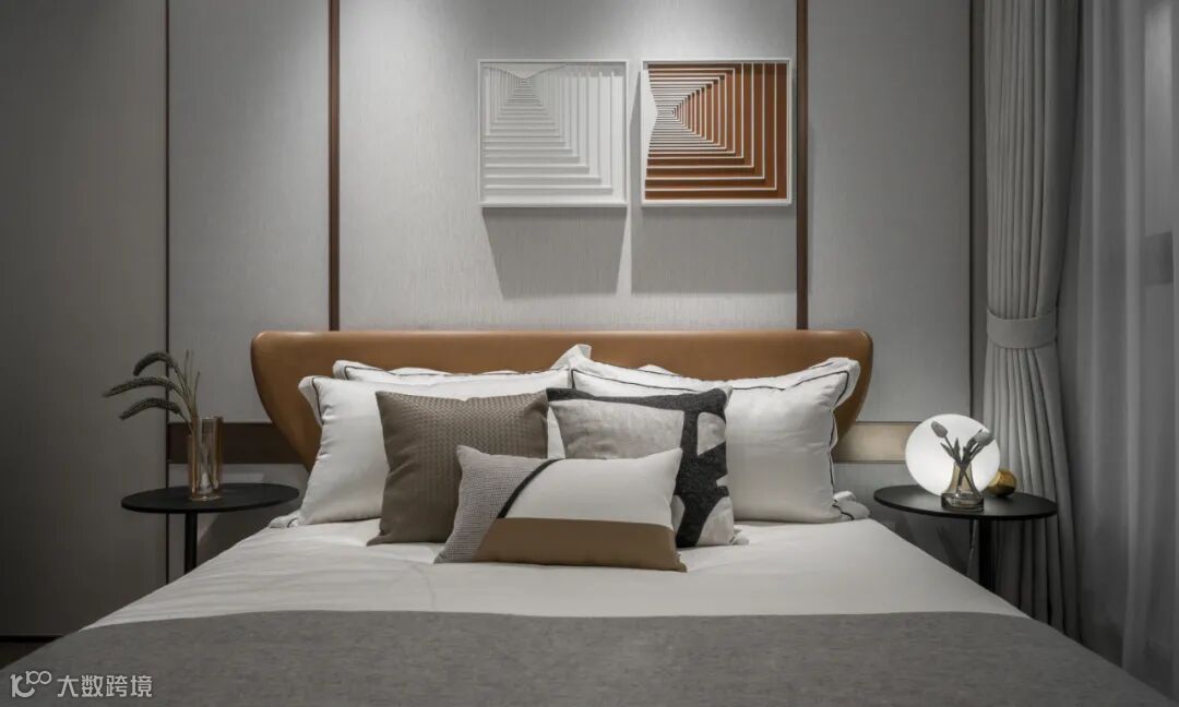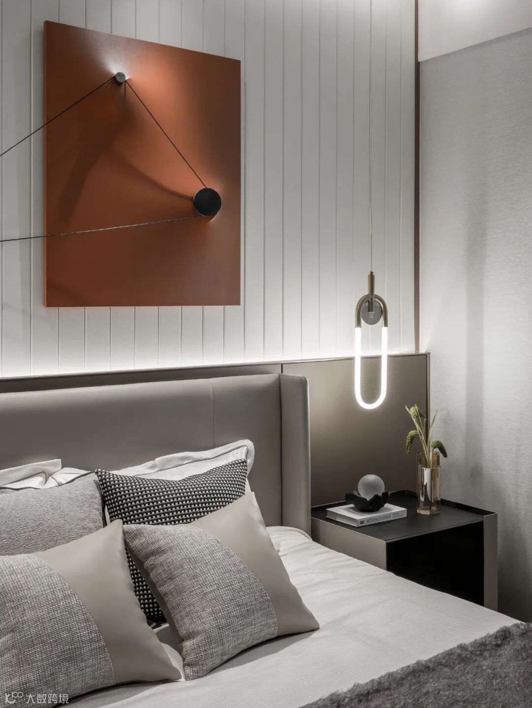 主卧以一幅创意装置挂画点亮了空间。画上爱马仕橙色块斜拉出三维的线条与灯影,让静谧的休憩时光有了趣味缤纷的触发机制。