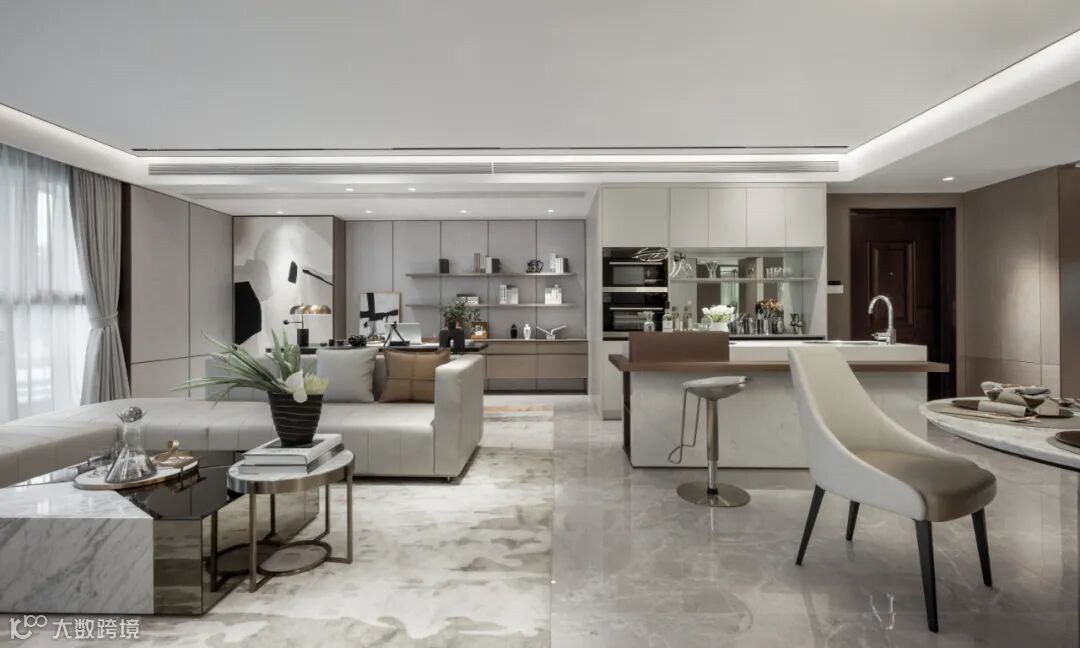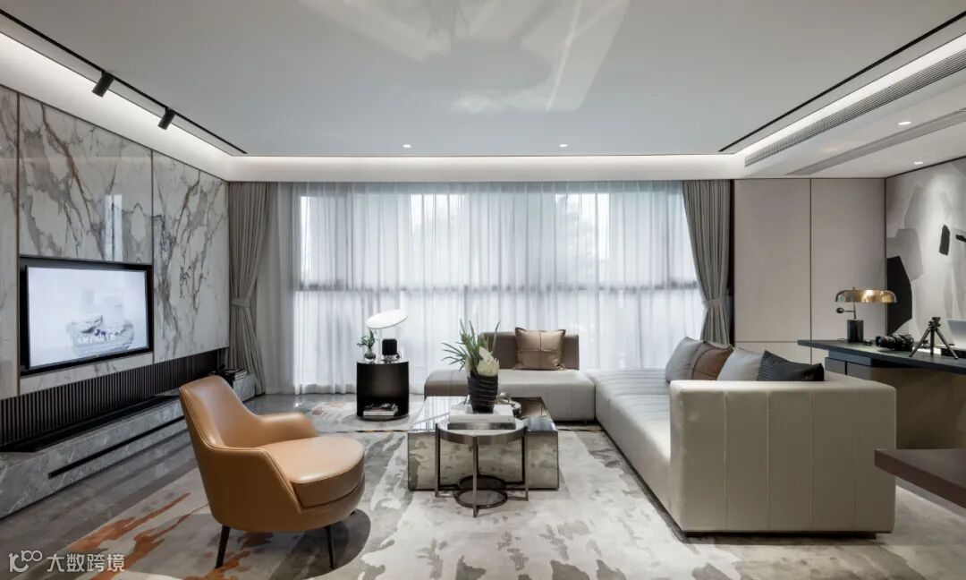 本案中,在空间开阔连贯的动线序列之上,设计师以浅灰与米咖为整体基调,同时加入温暖雅致的橙色,于现代都会的舒适氛围中注入节制的活力感,从容之余雅奢有度。