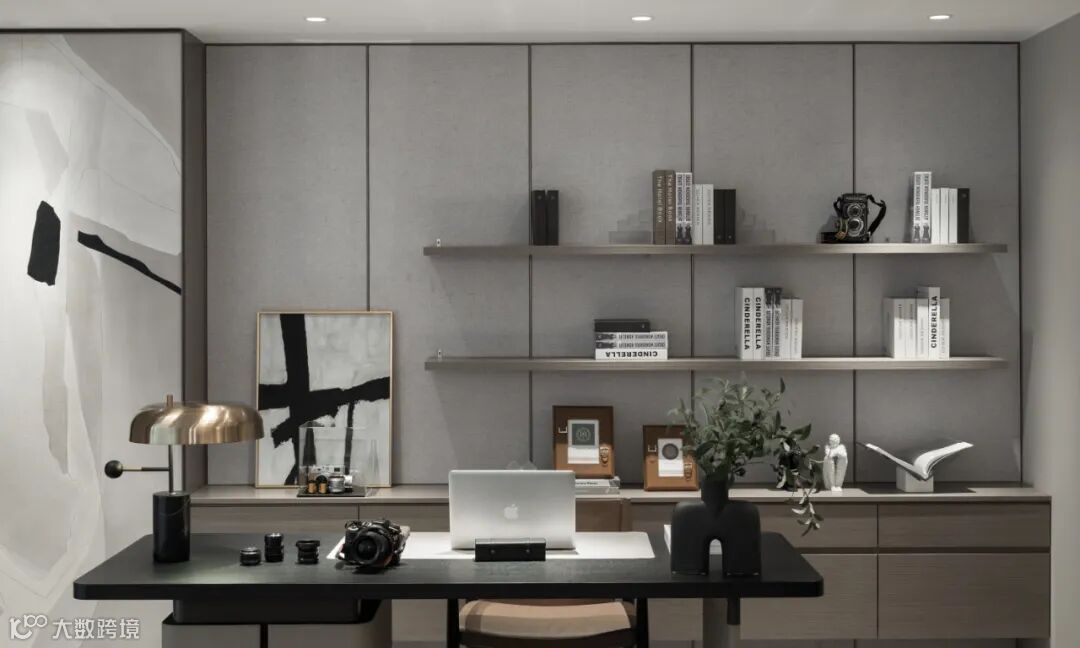 会客区与开放式书房毗邻相接。电视背景墙、地毯通过石材与织物的肌理,浸润出深深浅浅的水波纹,为互动交流构造出舒缓自在的场域。书房则以简单地拼色为底,透过纵横的线条措置出理性角落。