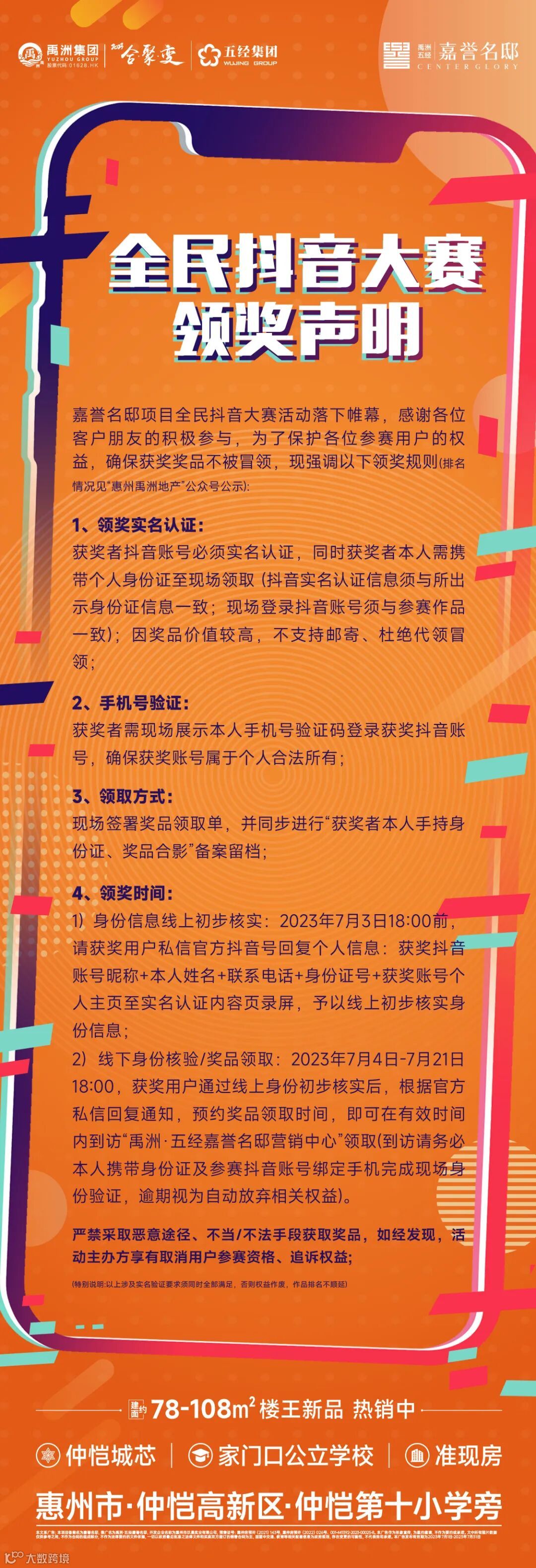 嘉誉名邸 | 全民抖音大赛领奖声明 惠州禹洲地产