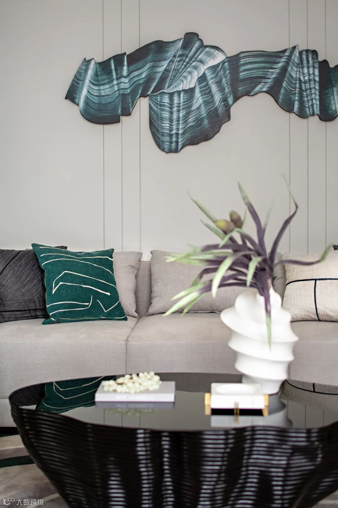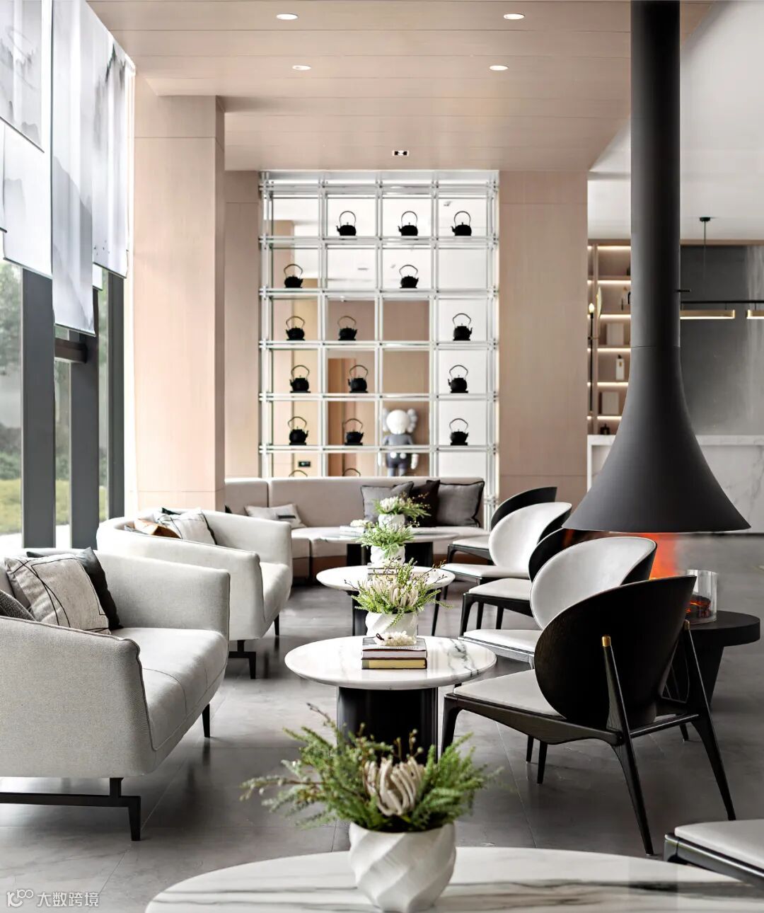 深度洽谈区的视觉印象更为浓烈。设计师落下相互呼应的两笔墨绿,碧波荡漾的潋滟闲走若浮云;茶几造型取意于梯田的迢递堆叠,沉稳而不失灵动。摆件、花瓶的造型亦别具一格,简洁中容纳着对诗意生活的哲思。