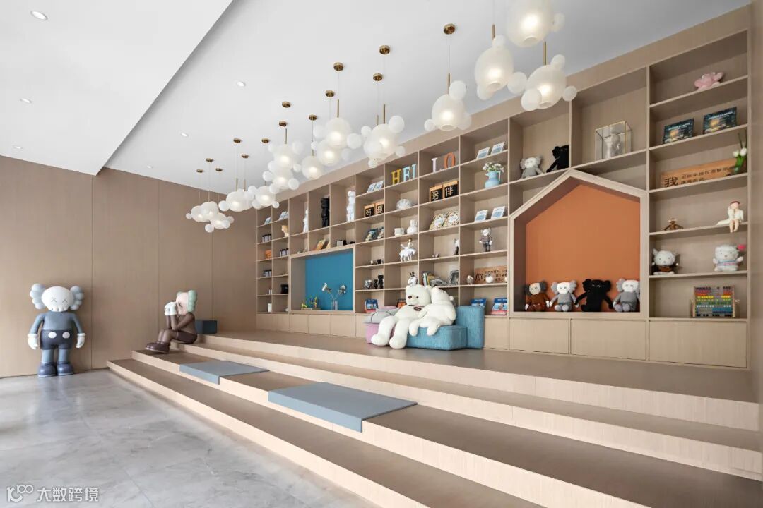 设计师将儿童区设置为开放的阶梯,并在背景墙中加入蓝色与橙色这一组对比色,同时拼贴潮玩装置、布偶玩具、玻璃泡泡球吊灯等元素,为空间注入了丰富的趣味,让这一方小天地有了童话世界的梦幻感。