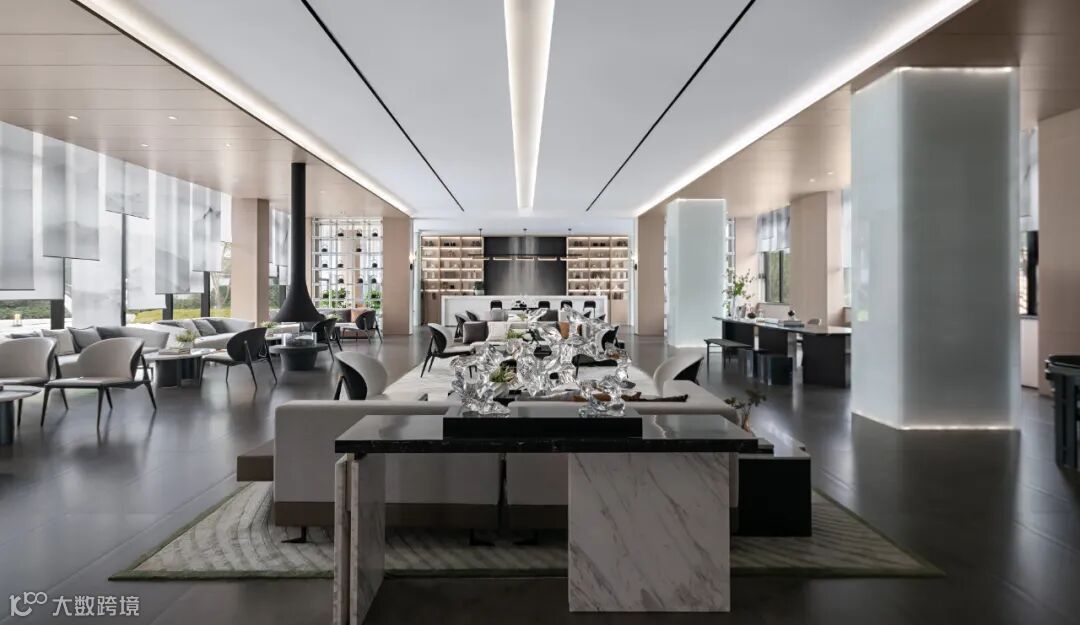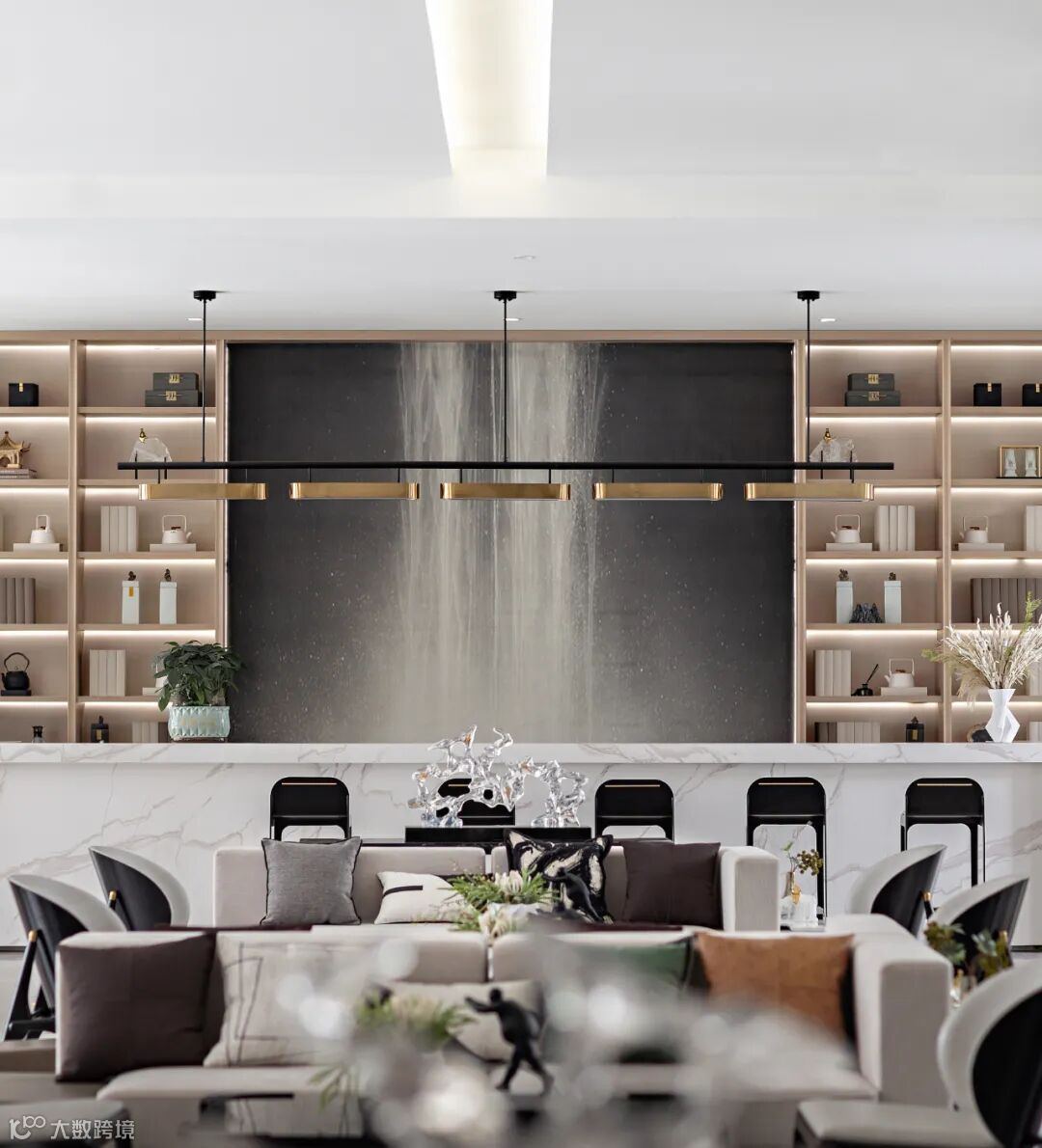 越过沙盘望去,中部洽谈区沿着吊顶中轴的灯带纵向分布,强化了视觉上的纵深感;灯带绵延至尽头的水吧台后,线条遽然下落,流泻出一方氤氲的黑白瀑布,泼洒禅意的同时也通过意象联动巧妙构筑出连贯的空间线索:灯如流水光作影,景换物移如越山。