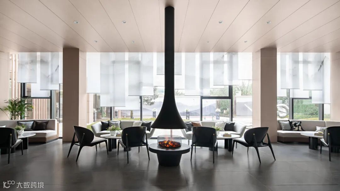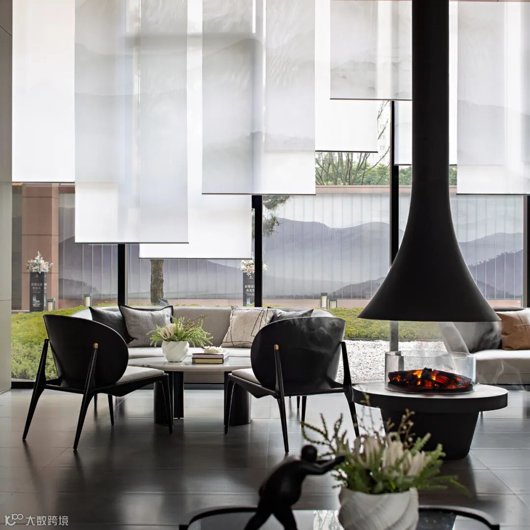 临窗一侧洽谈区气氛更为轻松自在——重重叠叠的遮光帘在落地窗前高高低低地错落悬挂,疏淡悠远的水墨山峦随之绰约浮动,诗意无涯。旁边形如滴墨的悬挂式壁炉则重新凝聚起视觉焦点,并营造出温馨的交流氛围。