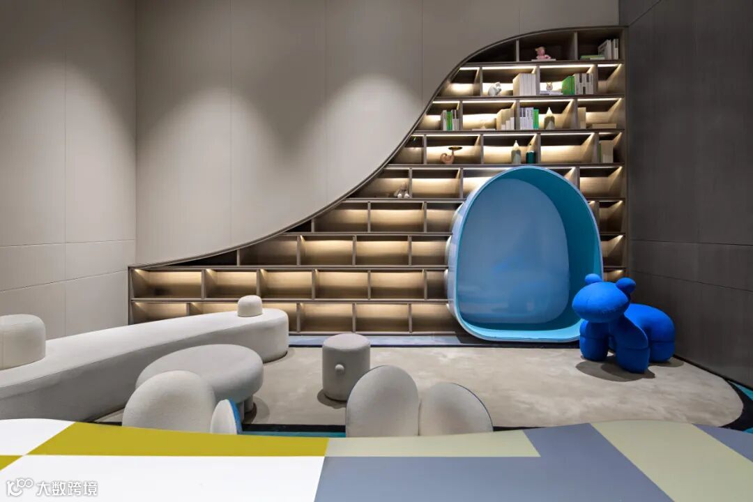 儿童区延续了外部稳健的色彩基调与线条井然的博物架,但又分别加入了蒙德里安的经典构图与色彩搭配,以及活泼灵动的弧线元素,在统一中衍生出新的变化。
