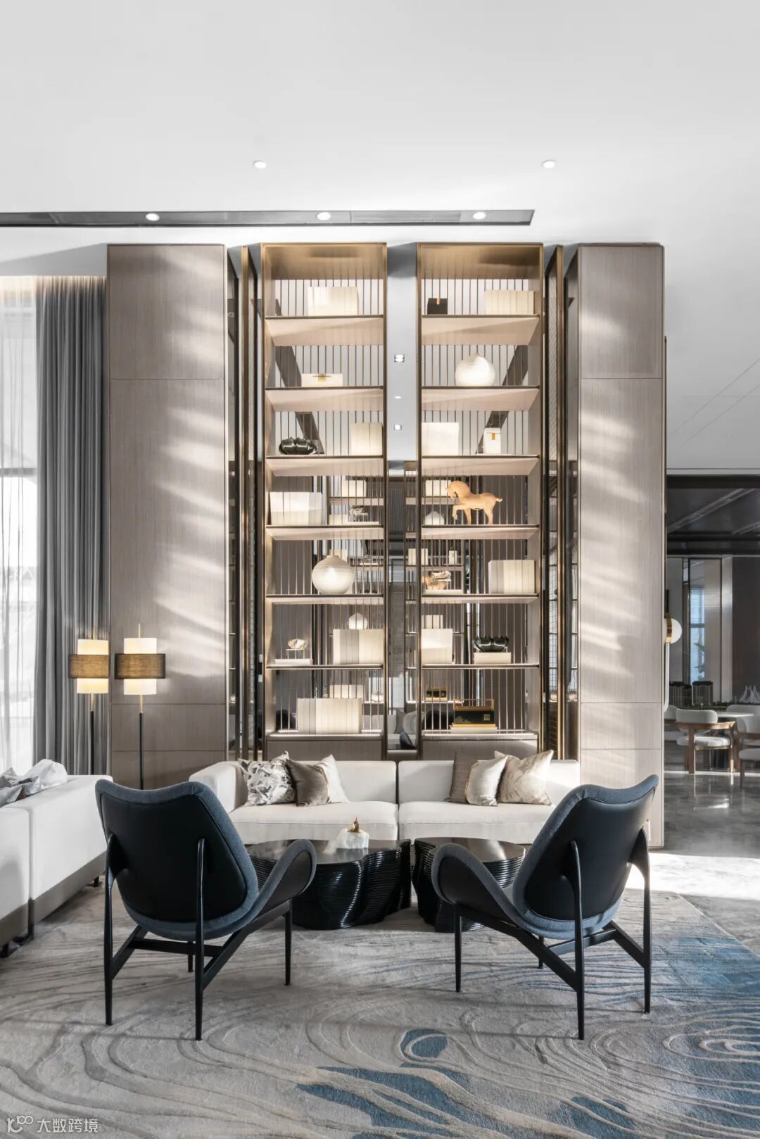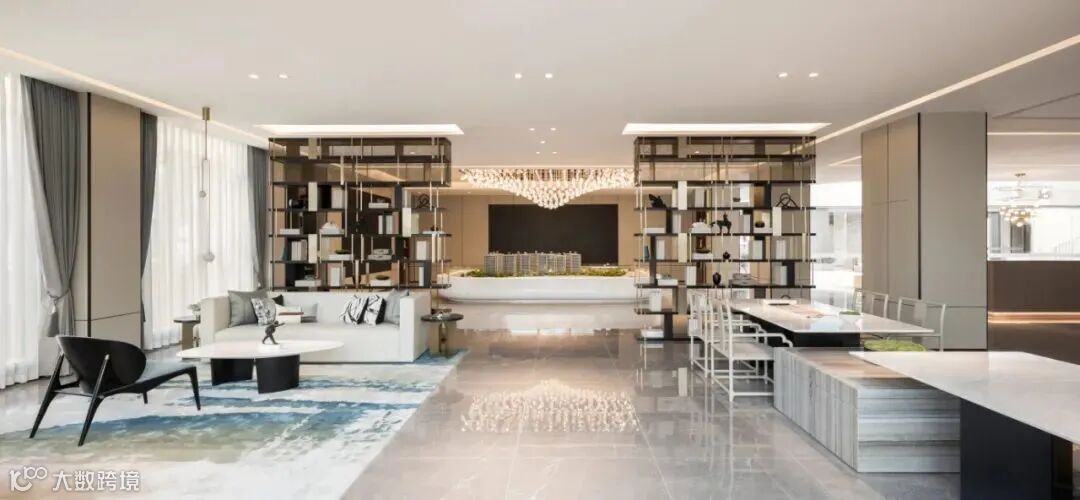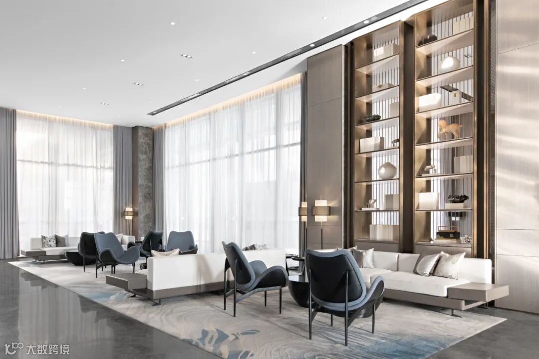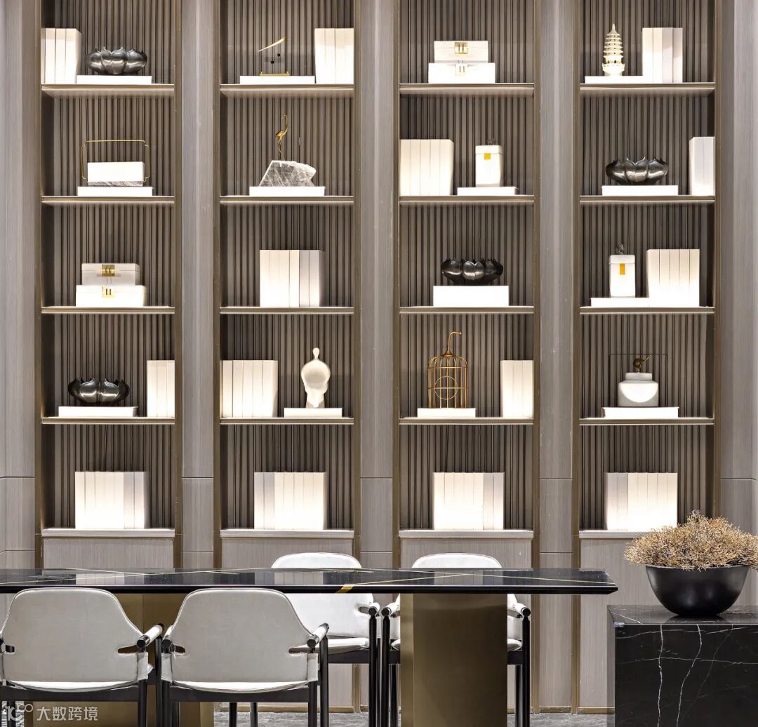 挑高的落地窗与顶天立地的博物架围合成班开放的洽谈分区,大开大合间气势俨然。充足的光线、水波纹流动的地毯、倒角圆润的家具、灵巧精致的摆件相互搭配,又于无形间削弱了严穆的气场,为沟通交流营造了轻松的氛围。