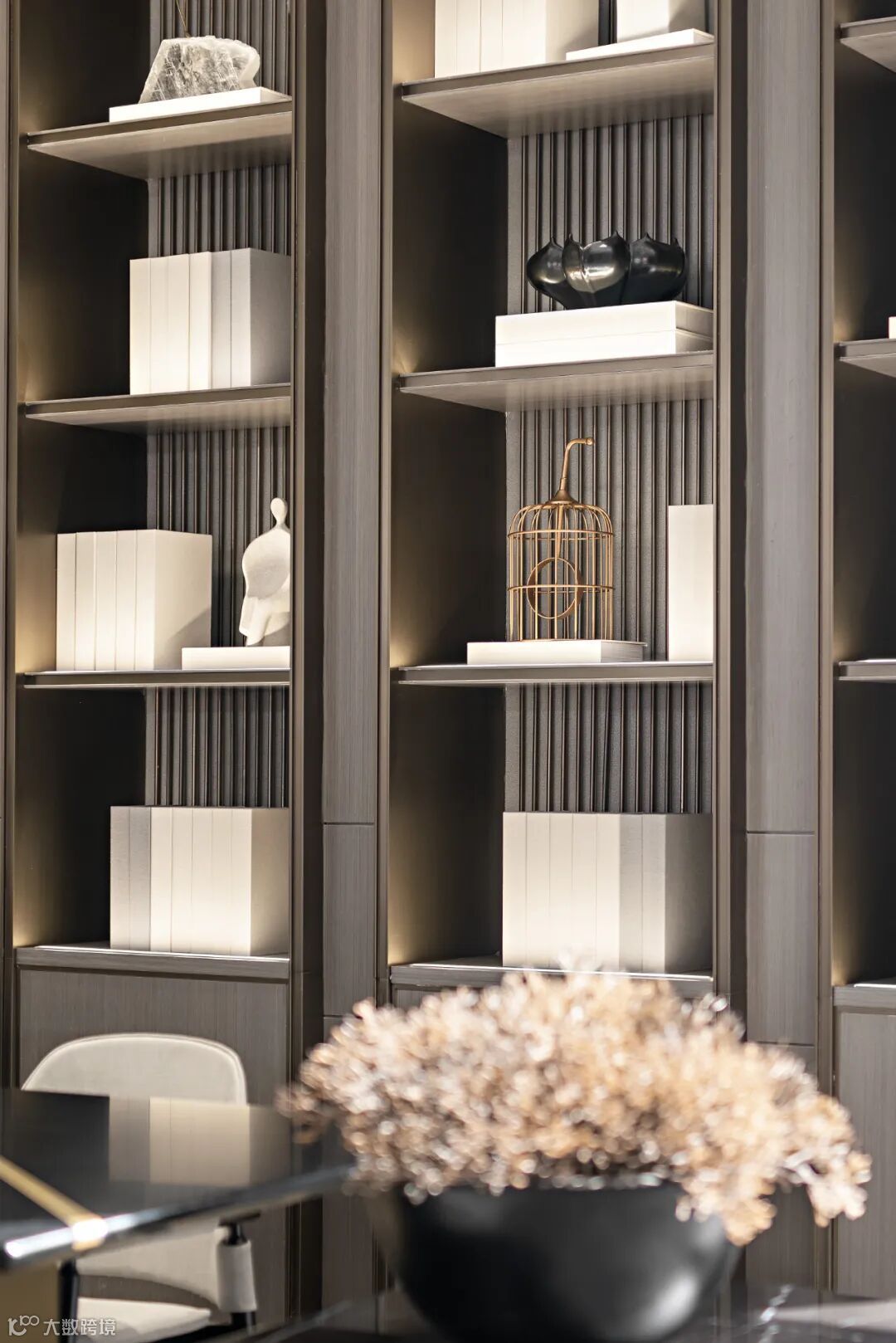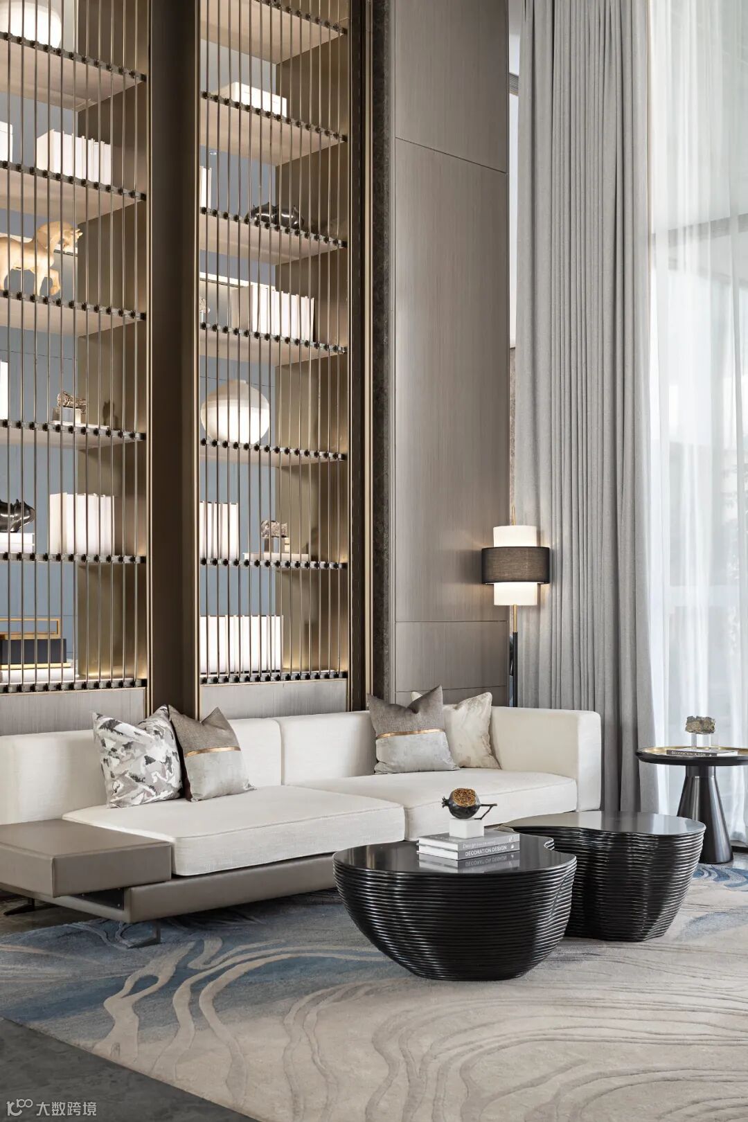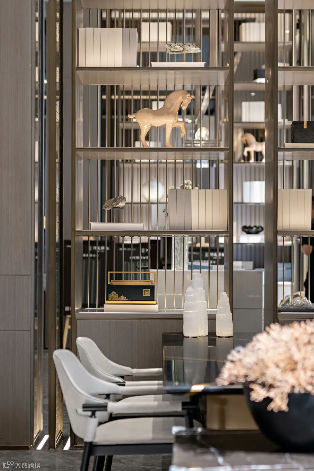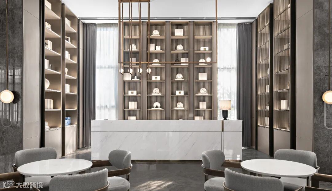 挑高的落地窗与顶天立地的博物架围合成班开放的洽谈分区,大开大合间气势俨然。充足的光线、水波纹流动的地毯、倒角圆润的家具、灵巧精致的摆件相互搭配,又于无形间削弱了严穆的气场,为沟通交流营造了轻松的氛围。