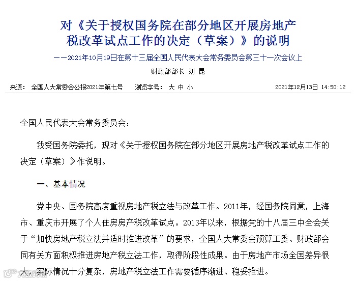 (1) 12月13日,全国人大官网发布“对《关于授权国务院在部分地区开展房地产税改革试点工作的决定(草案)》的说明”,提及“由于房地产市场全国差异很大,实际情况十分复杂,房地产税立法工作需要循序渐进、稳妥推进”。表明房地产税暂缓,如果新购的房子面积更小,要交的房地产税更少,甚至免征。
