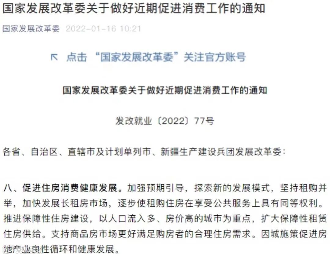 (5) 1月16日,国家发展改革委公众号发布信息,国家发改委近日发布《关于做好近期促进消费工作的通知》,提出要求促进住房消费健康发展,支持商品房市场更好满足购房者的合理住房需求,因城施策促进房地产业良好的循环和健康发展。