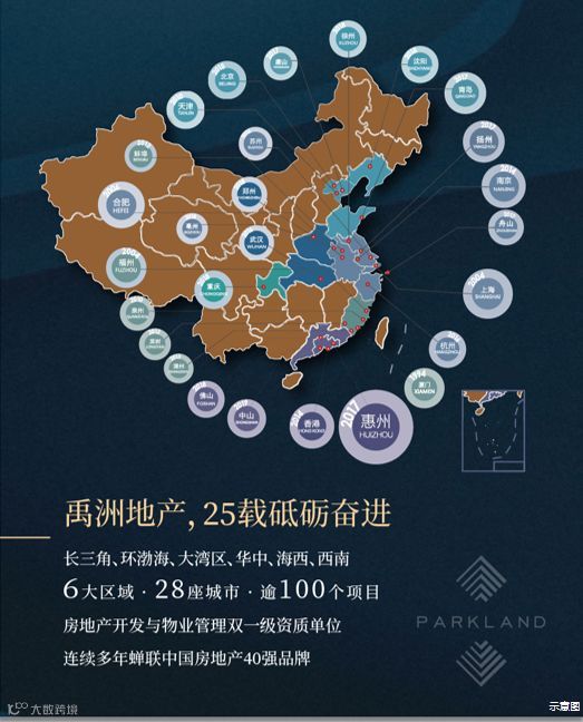 25年来,禹洲地产布局全国,精筑6大区域,深刻领会城市精神,充分解读居者需求,为城市献上一座又一座品质人居,成为当之无愧的高端生活先行者。大湾区作为禹洲长远战略版图的重中之重,也是禹洲未来发展的侧重点。自2014年进军香港开始,禹洲接连通过招拍挂、收并购、合作开发等多种方式进入大区域内及周边的核心城市,并于近期加速深化土地储备。