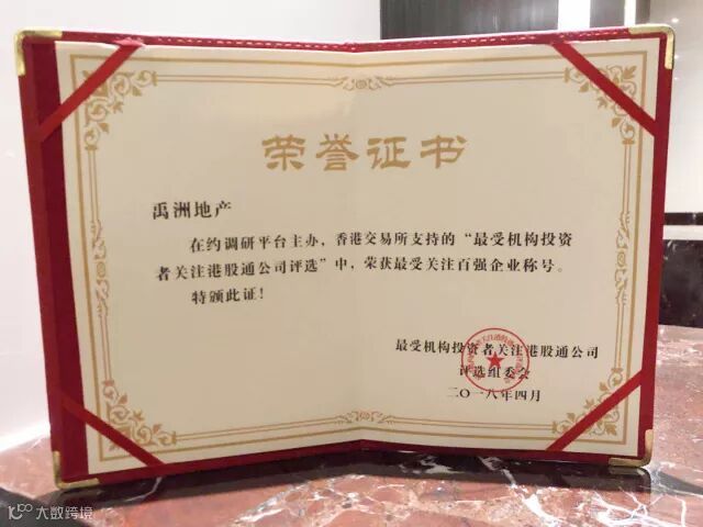 2018年4月25日,禹洲地产凭借在过去一年优异的表现,入选首届“最受内地机构投资者关注港股通公司”(前100强)。