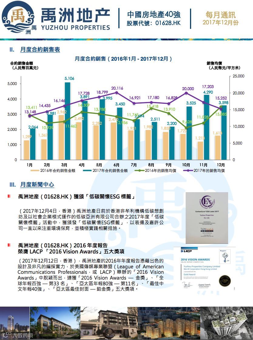 12月,禹洲地产份合约销售金额为人民币35.98亿元,同比增123% ;合约销售面积为235,897平方米。2017年12月的合约销售均价约人民币15,252元/平方米。