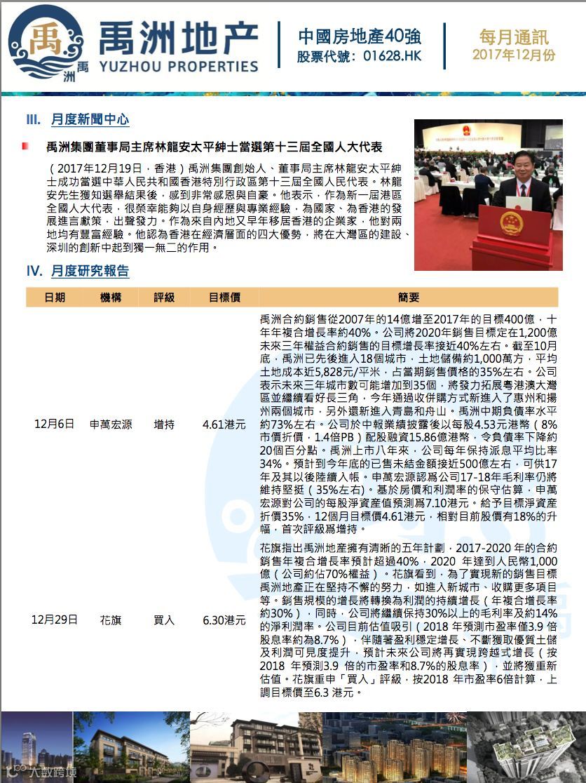 2017年,禹洲地产接连获得境内外知名券商覆盖。境内券商西南,国信,中金,申万相继首发覆盖报告。境外券商花旗,瑞信,中银,招银国际,招商证券,麦格里,中泰国际,农银国际,华泰证券,越秀证券,联昌国际等于年内多次推荐。境内外分析师普遍认为,禹洲地产90%的土地储备位于一二线城市,布局清晰,规模和利润平衡,资产负债风险维持在可控的范围,股息率过去数年都维持在8-10%,目前估值仍处于较低区间。12月29日,花旗重申“买入”评级,上调目标价至6.3港元。花旗预计,禹洲地产2018-2020年将再实现跨越式增长。