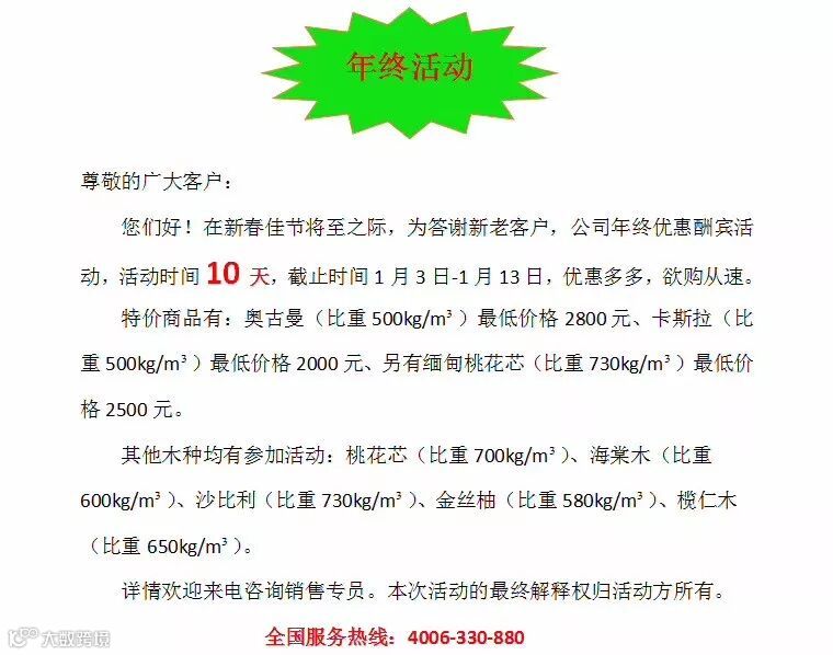 2019双发木业新年促销活动~~新的一波正在进行中,奥古曼 海棠木 卡斯拉 桃花芯,各种规格齐全,质量上乘,要砸单的赶紧咯!!