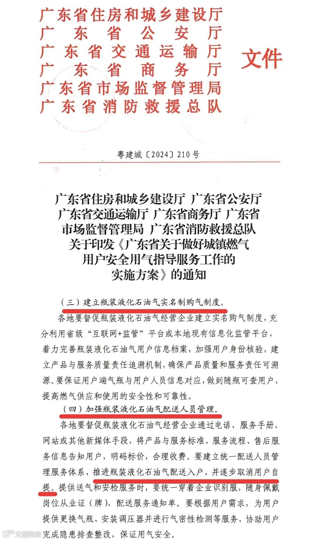 其中规定,燃气经营企业必须实行瓶装液化石油气实名制购气;逐步取消用户自提服务;建立统一配送,入户安检的标准流程。