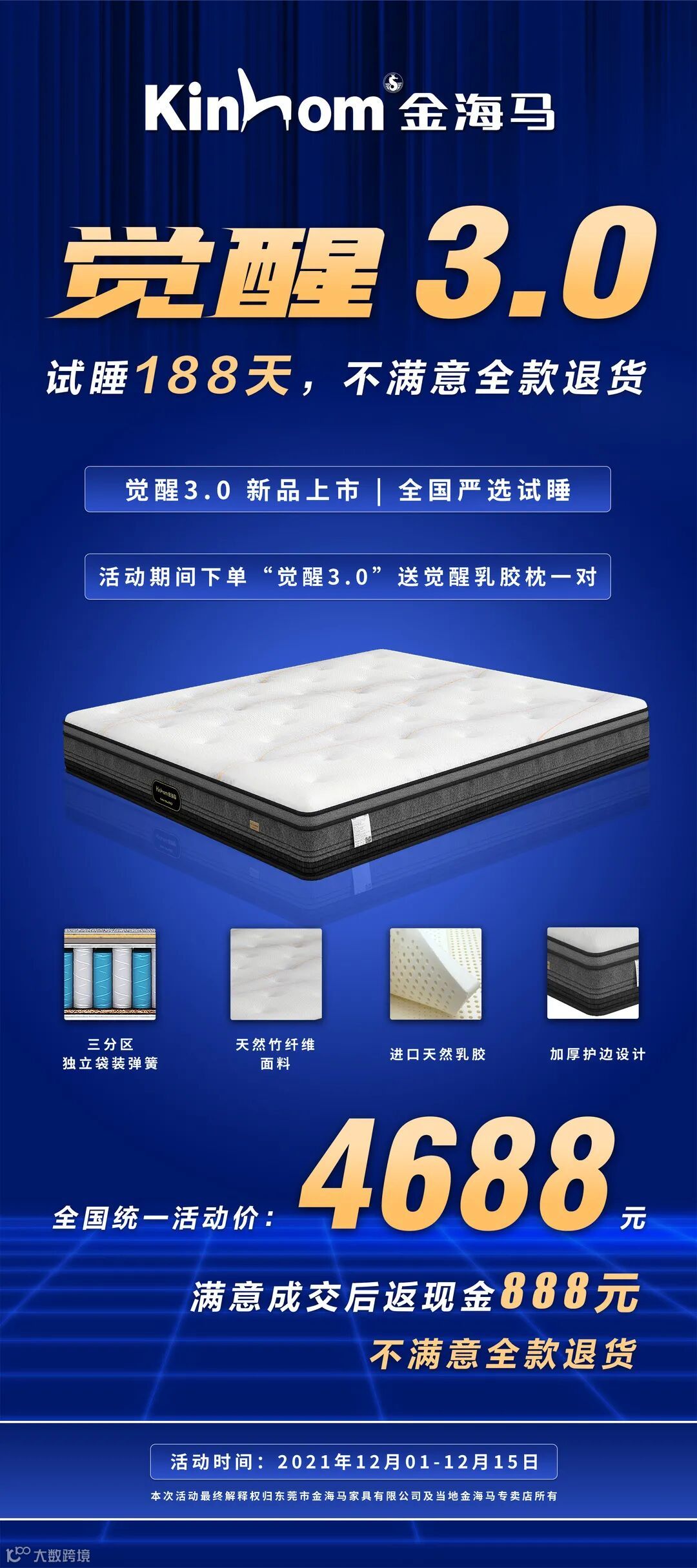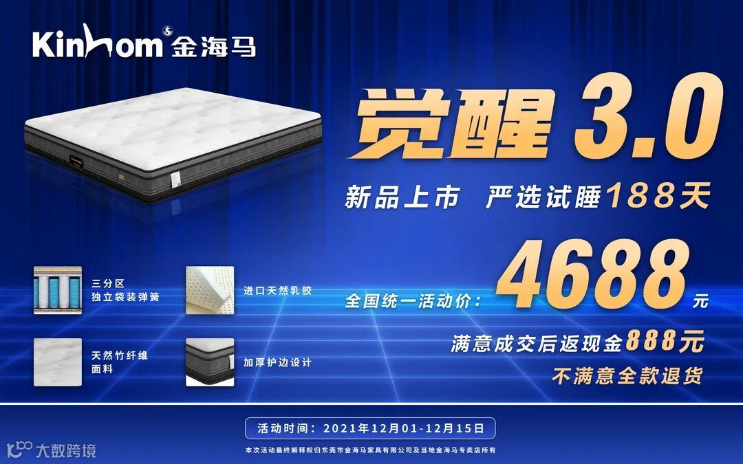 这等好事,如何参加?活动期间,在金海马全国各专卖店店购买金海马“觉醒3.0”床垫产品的顾客均可参加。客户活动期间下单“觉醒3.0床垫”,现场赠送“觉醒乳胶枕”一对。试睡日期从下单之日起开始计算,消费者188天内对购买产品有任何不满意,均可到购买店面全款退货,如满意成交后,当场立返现金888元!
