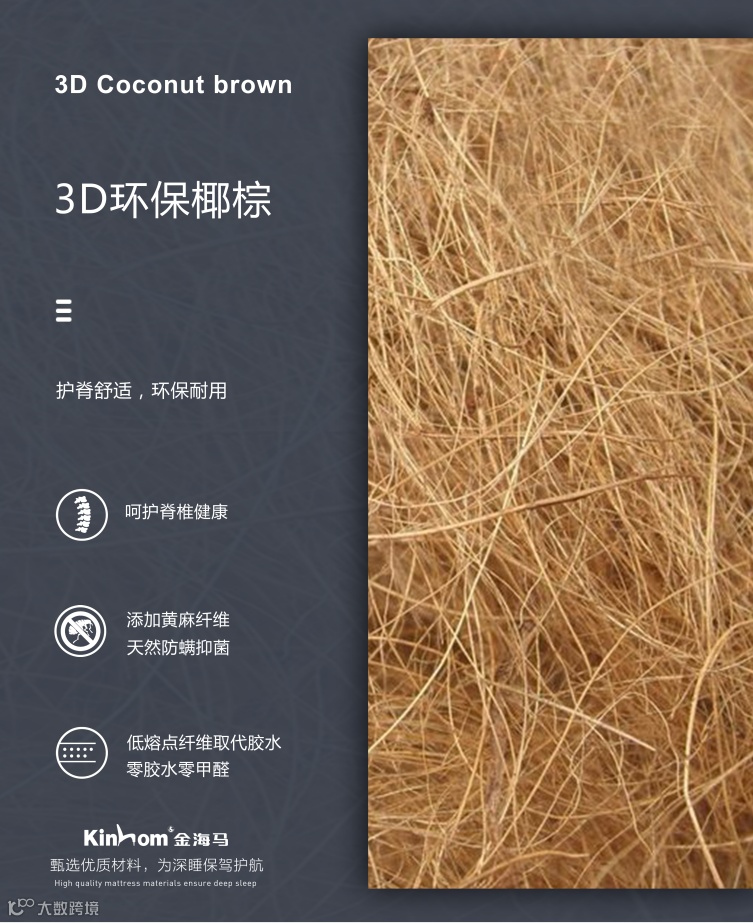 在天然材料之中,棕丝的强韧与弹性是十分适合成为床垫填充物的。棕丝的层叠产生的空隙非常有利于通风透气纤维结构相对密实,不会因潮湿与干旱产生太大变化。3D环保棕丝具有一定的硬度,同时所含有营养物质不多,不易遭受害虫侵蚀。并在其中添加黄麻纤维,天然防螨抑菌。