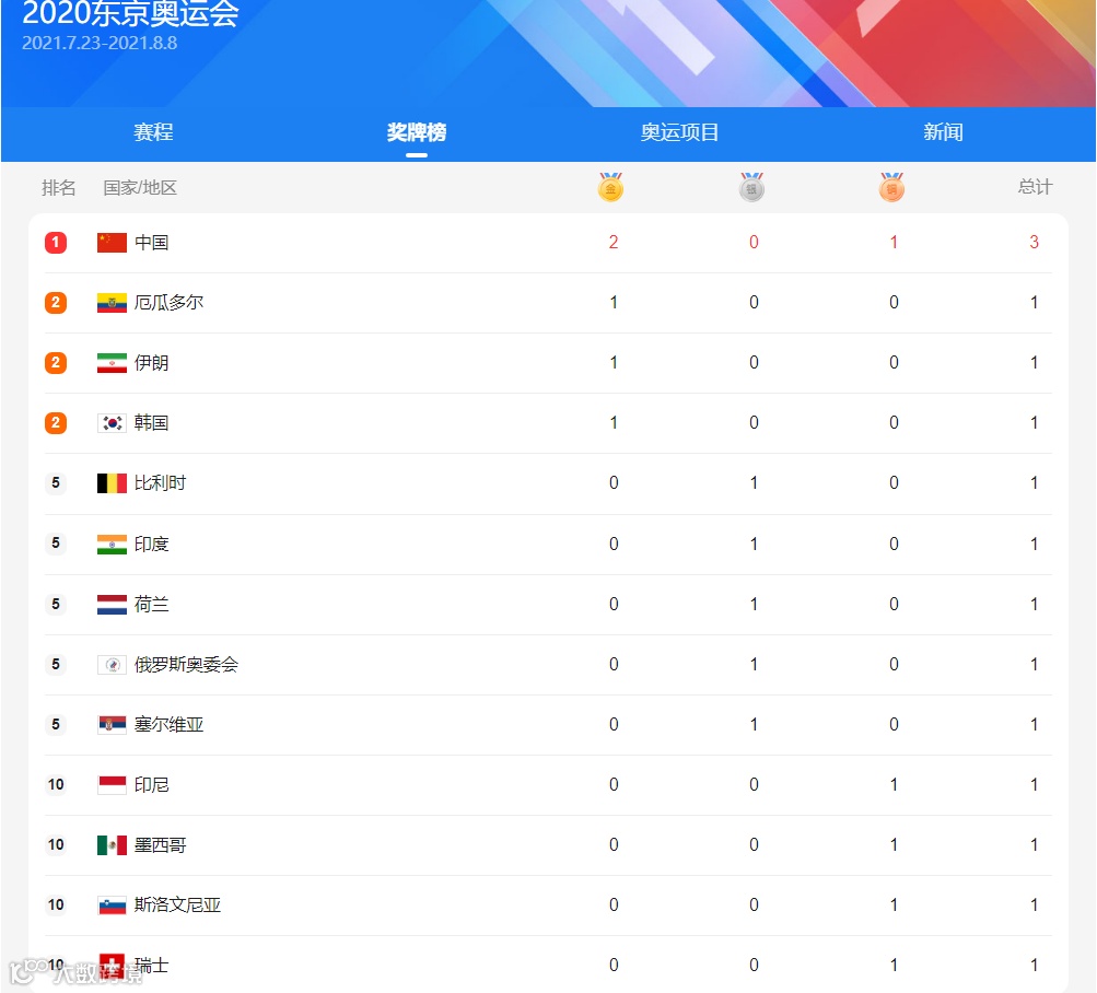 东京奥运会实时奖牌榜