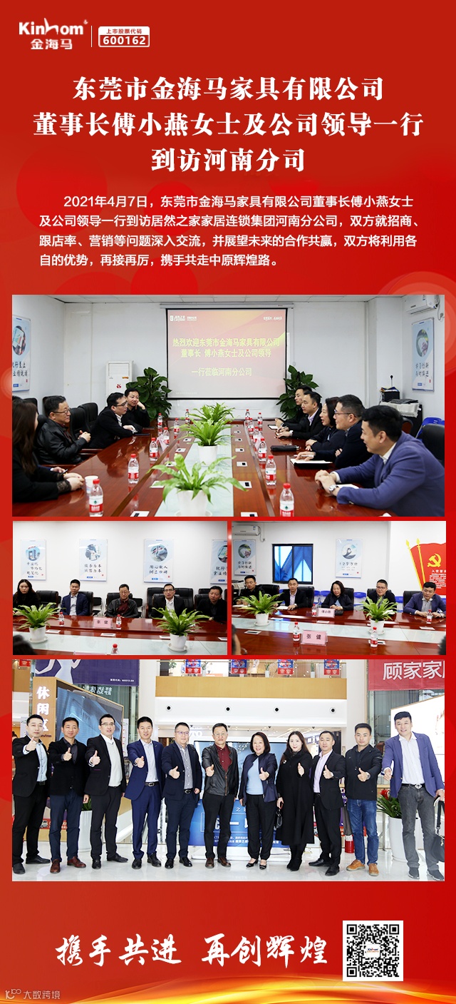 2021年4月7日,东莞市金海马家具有限公司董事长傅小燕女士,营销总监郭先伟先生及公司高管团队一行人到访居然之家家居连锁集团河南分公司,与居然之家家居连锁集团河南分公司总经理张健先生进行合作洽谈。