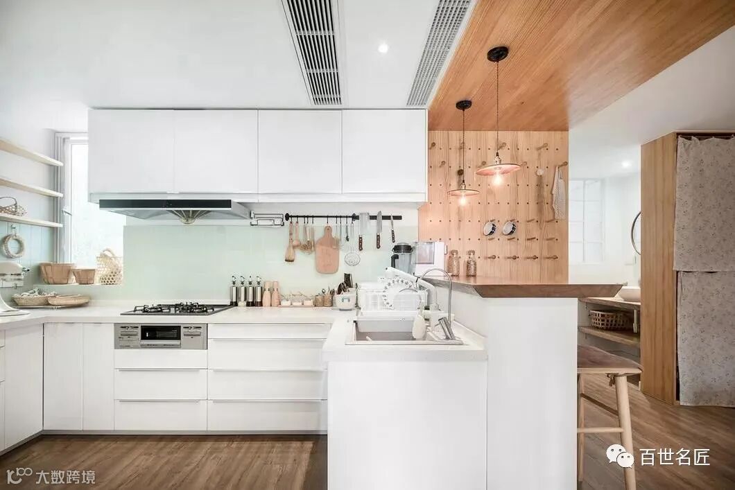 为了解决原大进深户型中餐厨区域的封闭与昏暗,设计拆除了原户型中餐厨间的墙体,扩展出一个带吧台的开放式厨房,间接引入采光。