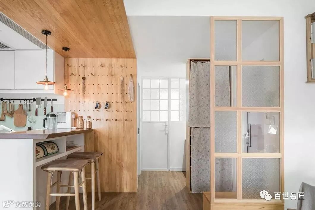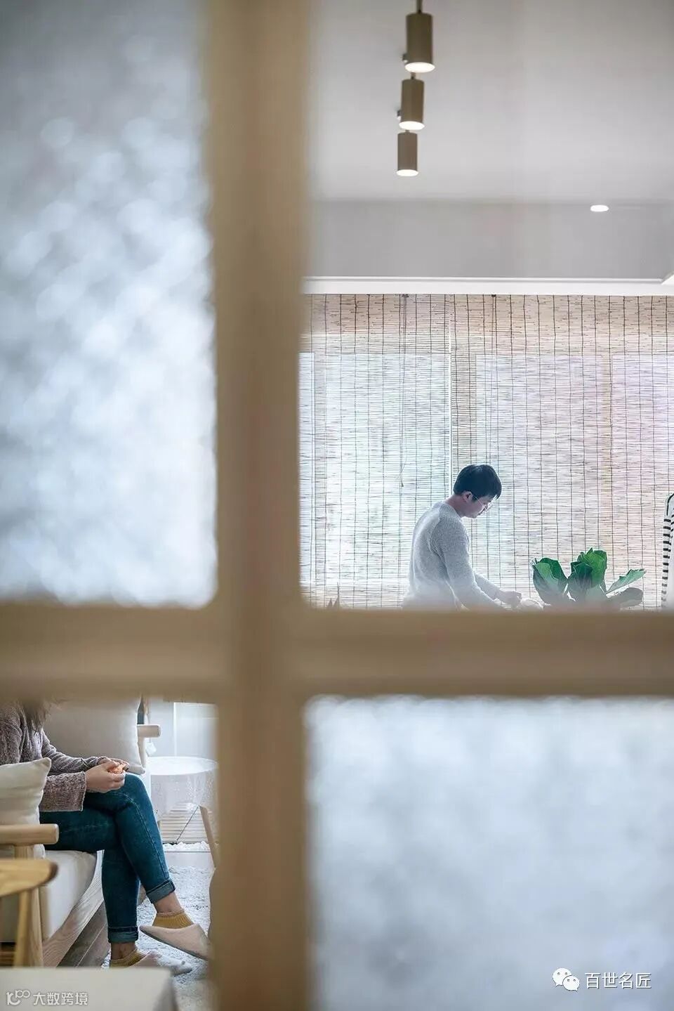 一片玻璃隔断将玄关限定出来,客厅、餐厅、玄关相互渗透。餐厨与客厅、玄关混合形成的L形空间,容纳二人世界的烹饪、就餐、游戏 、会客等多样化活动。空间中的一片木质吊顶结合书架洞墙串联空间,形成框景画面。