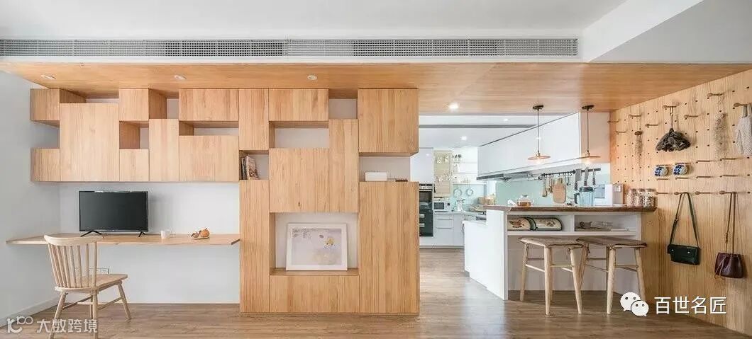 开放共享的LDK空间,木质吊顶与书柜组合一体。书柜“实体”与“空心”间错布置,柜门沿“空心”处侧面开启,一片轻薄的工作台面漂浮其间。