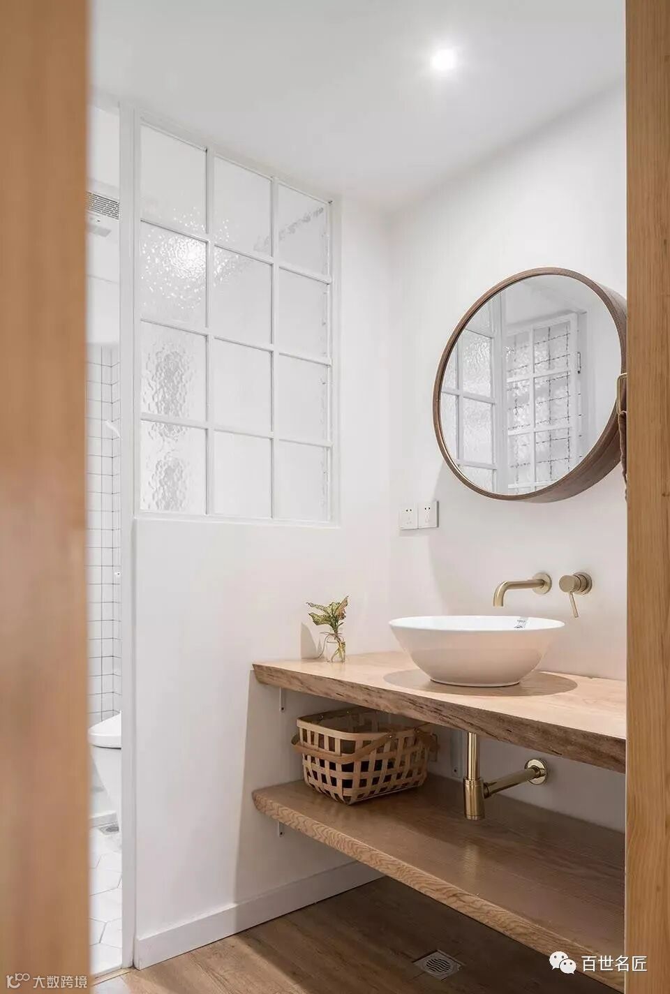 用白色钢窗配合水波纹玻璃区分卫生间干区和湿区,干区两块原木板构成台面和储物空间。