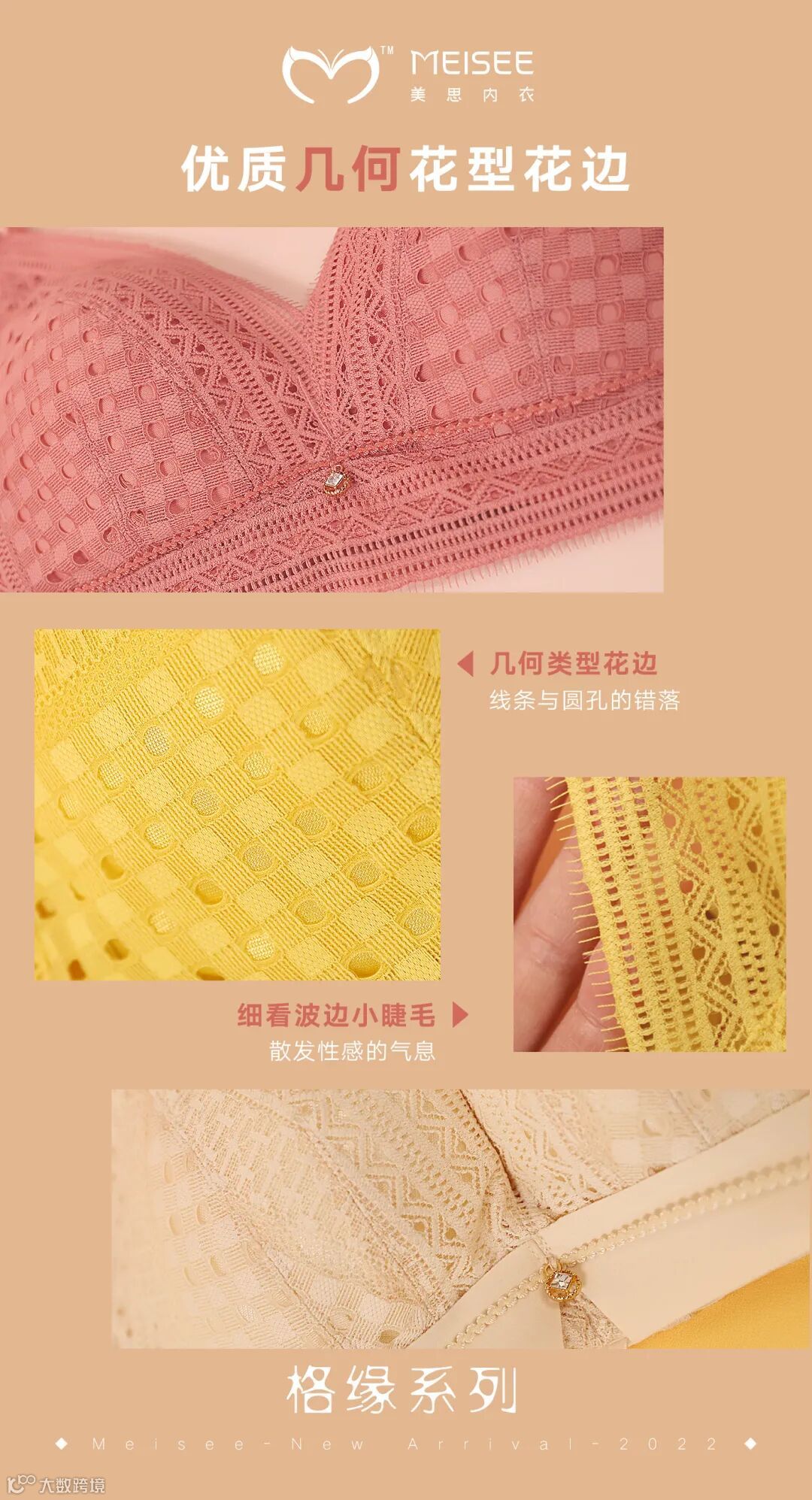 蕾丝融入几何图形,线条与圆孔的错落搭配,花型活跃立体,整体显得优雅迷人。