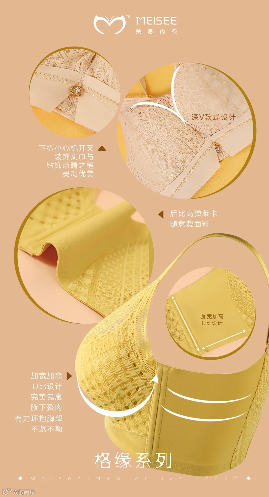 ② 高弹莱卡随意裁面料,加宽加高U比设计,完美包裹腋下赘肉,有力环抱胸部。