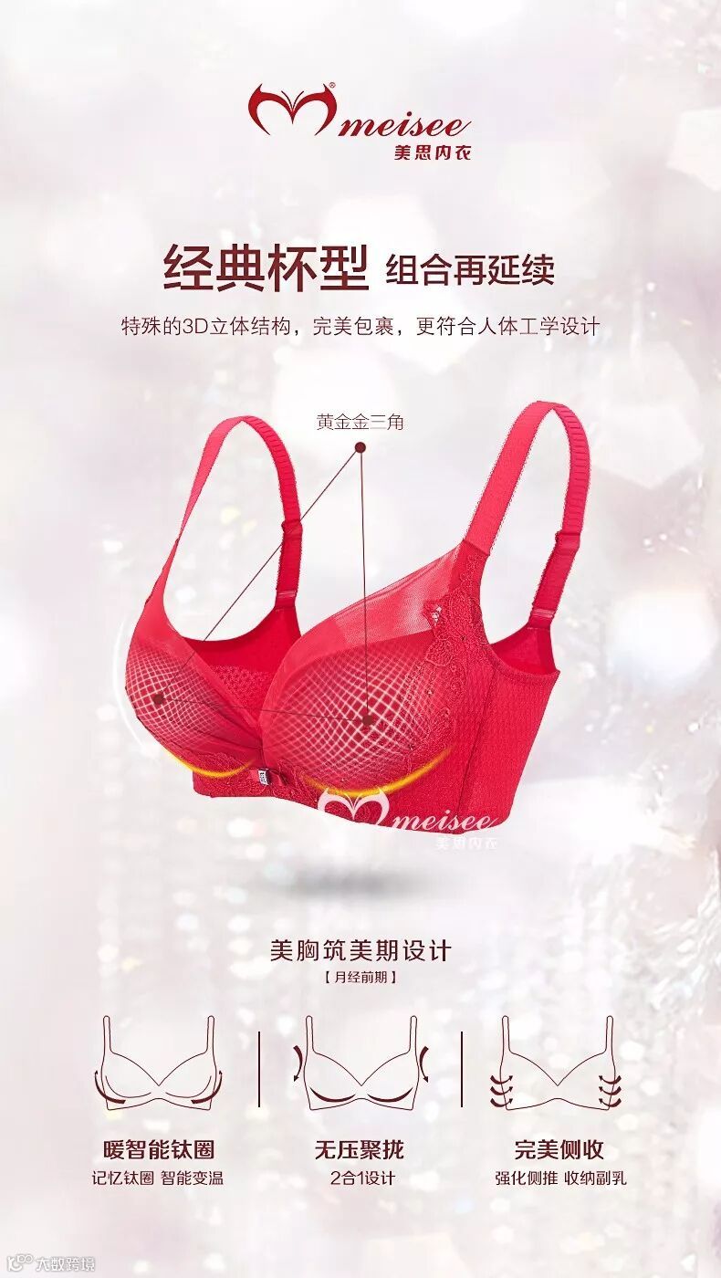 美思水晶之恋系列,属时尚调整型产品,她巧妙运用了水溶刺绣+提花作为装饰,延续3D立体经典杯型,是简约和精致的糅合,全能包裹,更显高雅性感!