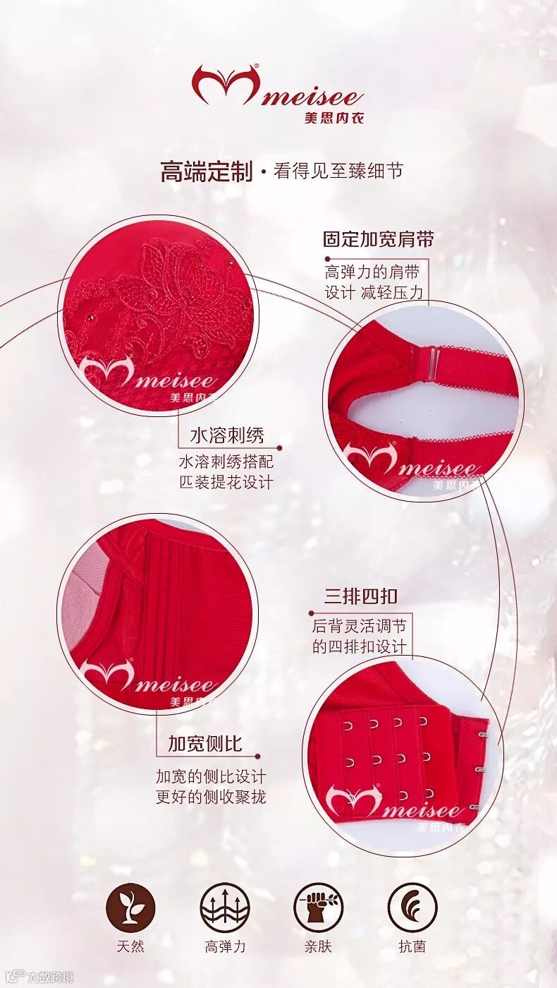 美思,高端品质、亲民价格、全民乐享。本系列产品杯型一应俱全,从中厚的AB被到软绵C杯,满足了广大女性朋友穿着需求。此外,细节追求精益求精,视觉上赏心悦目,大方高雅。