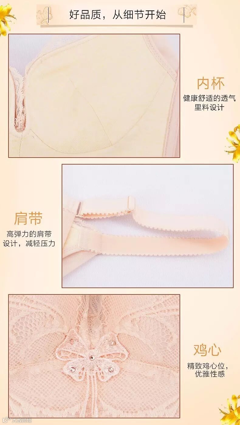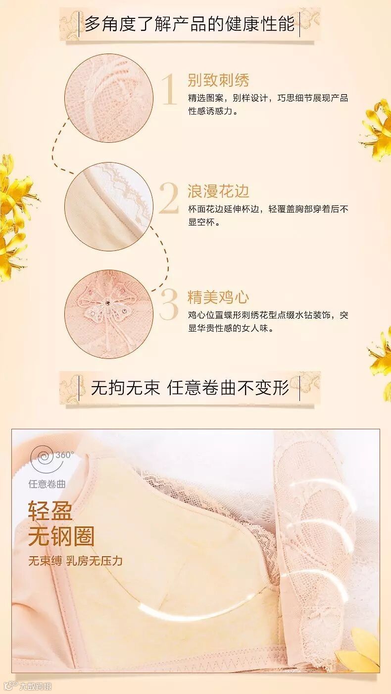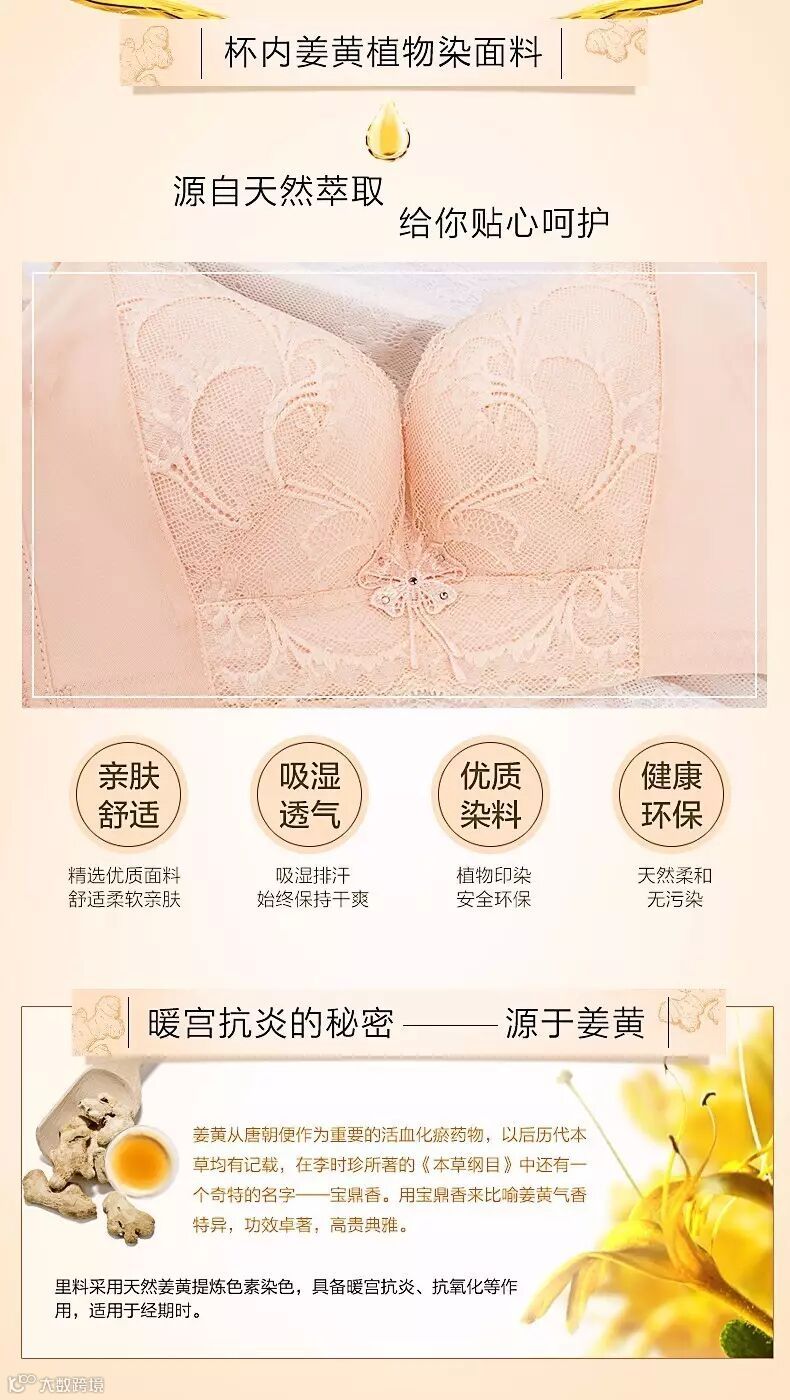 产品采用独特气质的蕾丝花边,精致花型细腻点缀,立体感强,营造出法式浪漫,优雅气质油然而生!而杯内则萃取姜黄植物染面料,保健功效卓著,全方位贴心呵护,让乳房更轻松,让生活更自如!