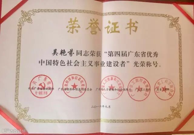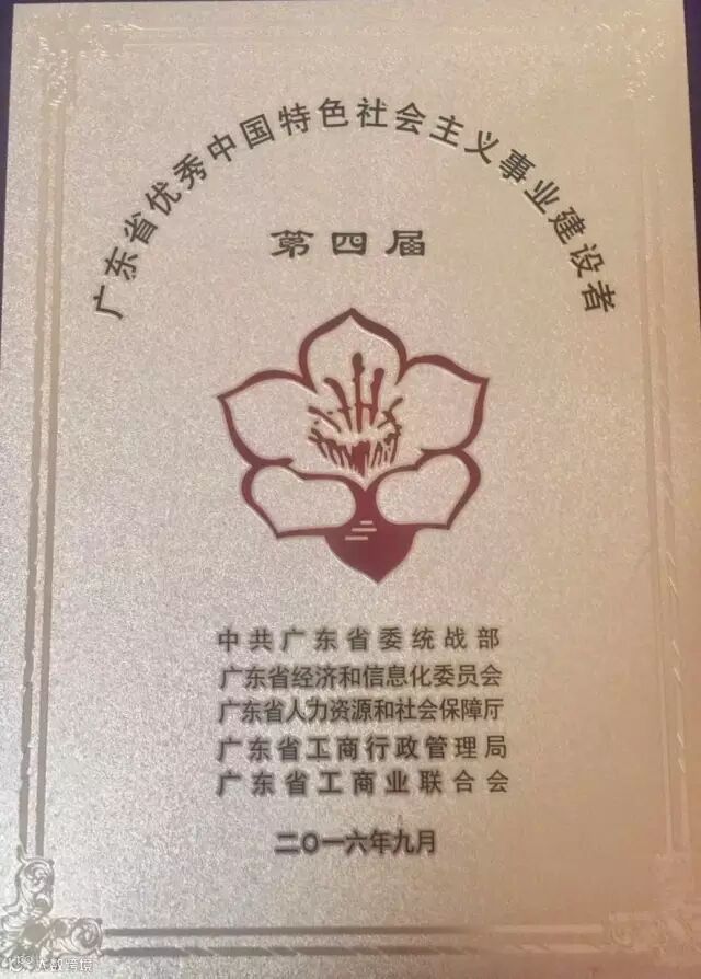 “粤商新使命,聚力新跨越”第三届粤商大会在番禺长隆酒店圆满成功举行。中央政治局委员、广东省委书记胡春华等多位省级重要领导出席会议。在中共广东省委统战部、广东省经济和信息化委员会、广东省人力资源和社会保障厅、广东省工商行政管理局、广东省工商业联合会联合开展的第四届广东省非公有制经济人士优秀中国特色社会主义事业建设者评选表彰活动中,经过各地推荐、严格评审和社会公示,是国家给予“政治上有觉悟,经济上有实力,社会上有影响,对人民有贡献”的非公有制经济人士的崇高荣誉。